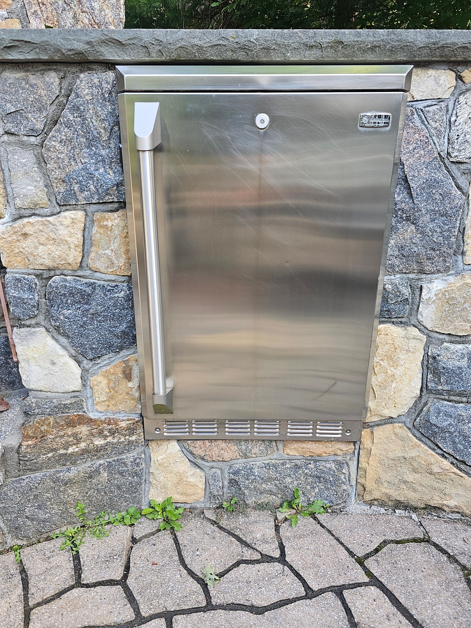 GE Monogram Outdoor Refrigerator - notice right side hinged. Measures 23 1/2 x 36 with an inside depth of 19 inches