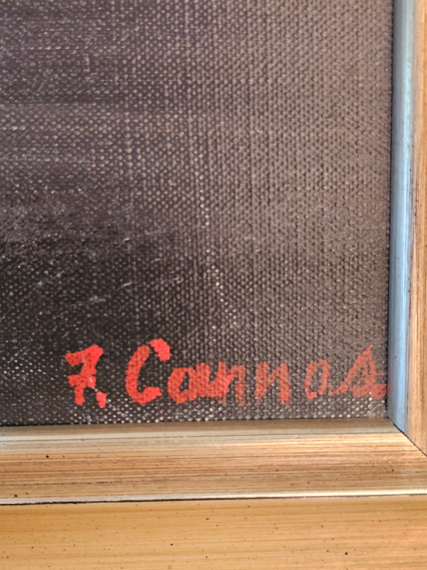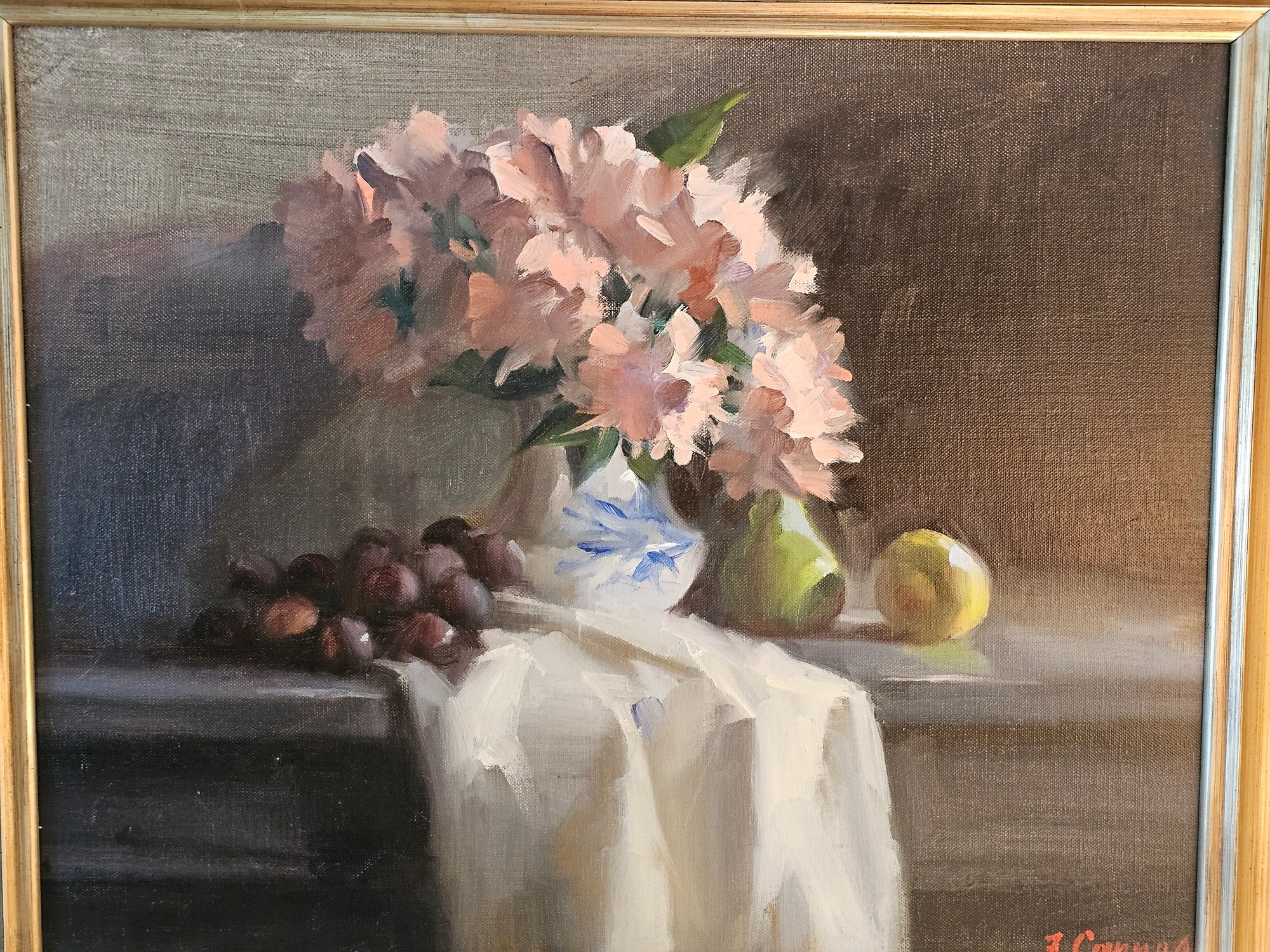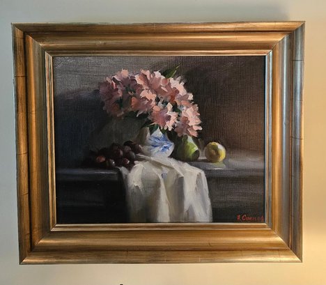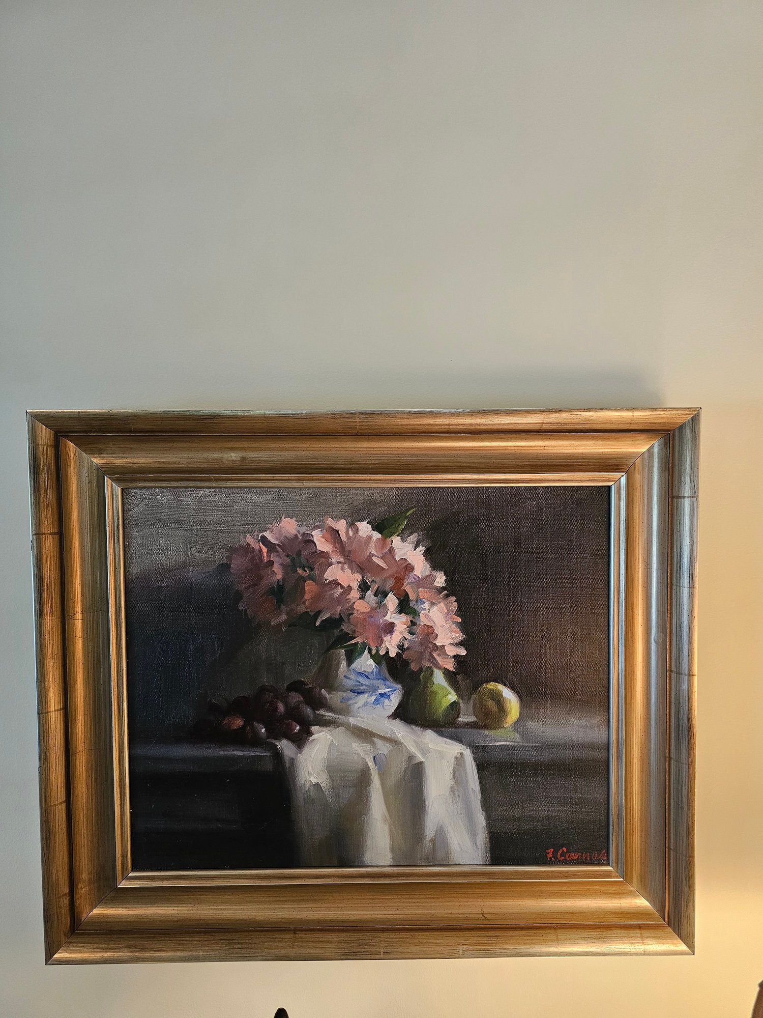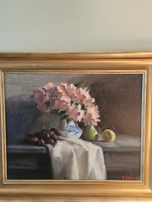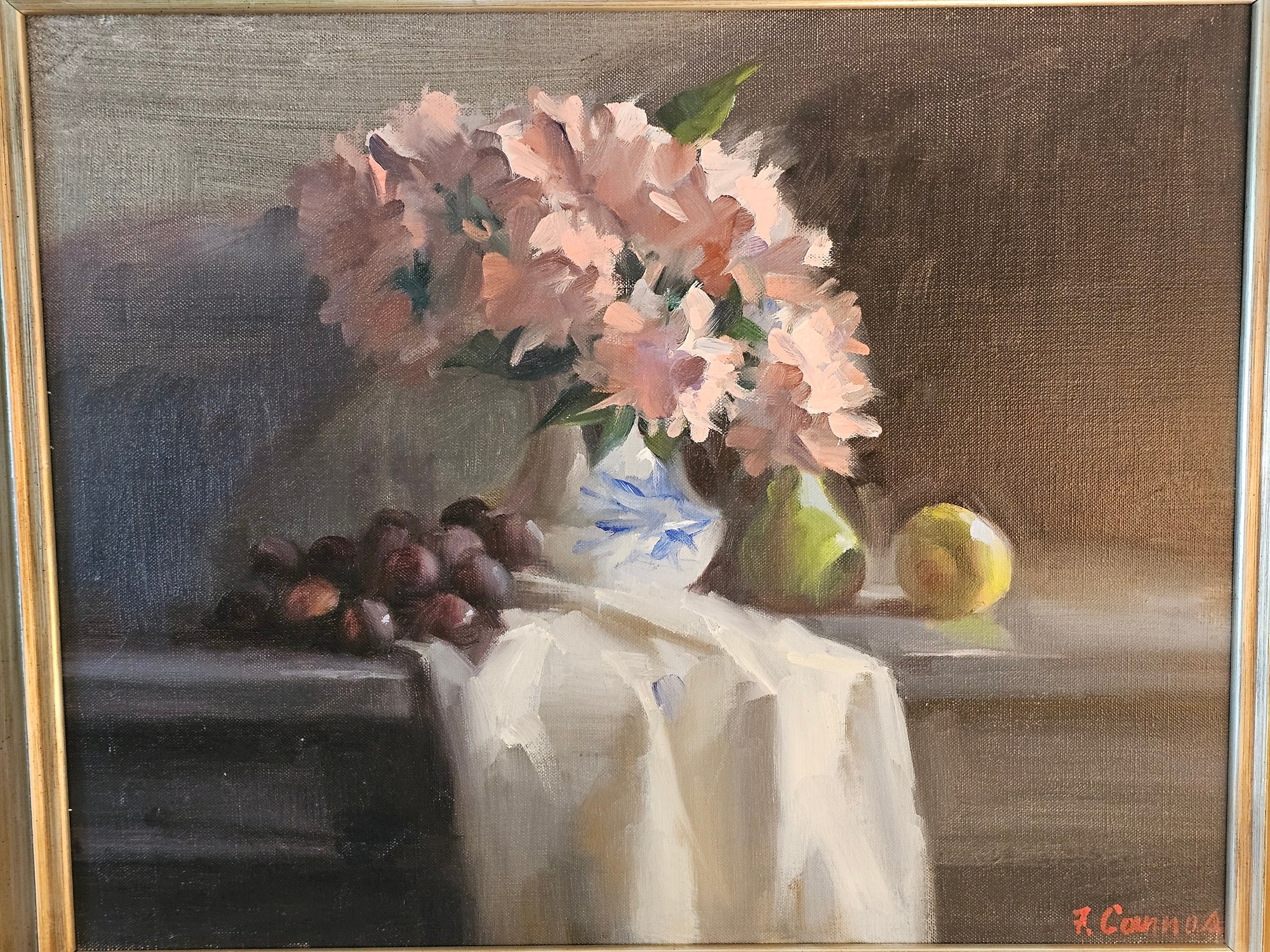 Floral and Fruit Still Life Oil on Canvas by artist Frank Cannas b. 1936 New York. Measures 25 1/2 x 21 1/2