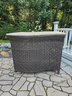 Frontgate Outdoor Bar with travertine or similar stone top, shelving and storage behind. Bar is 43x50x21