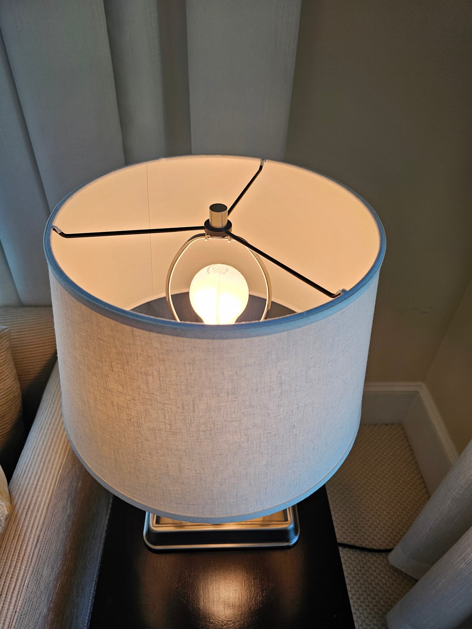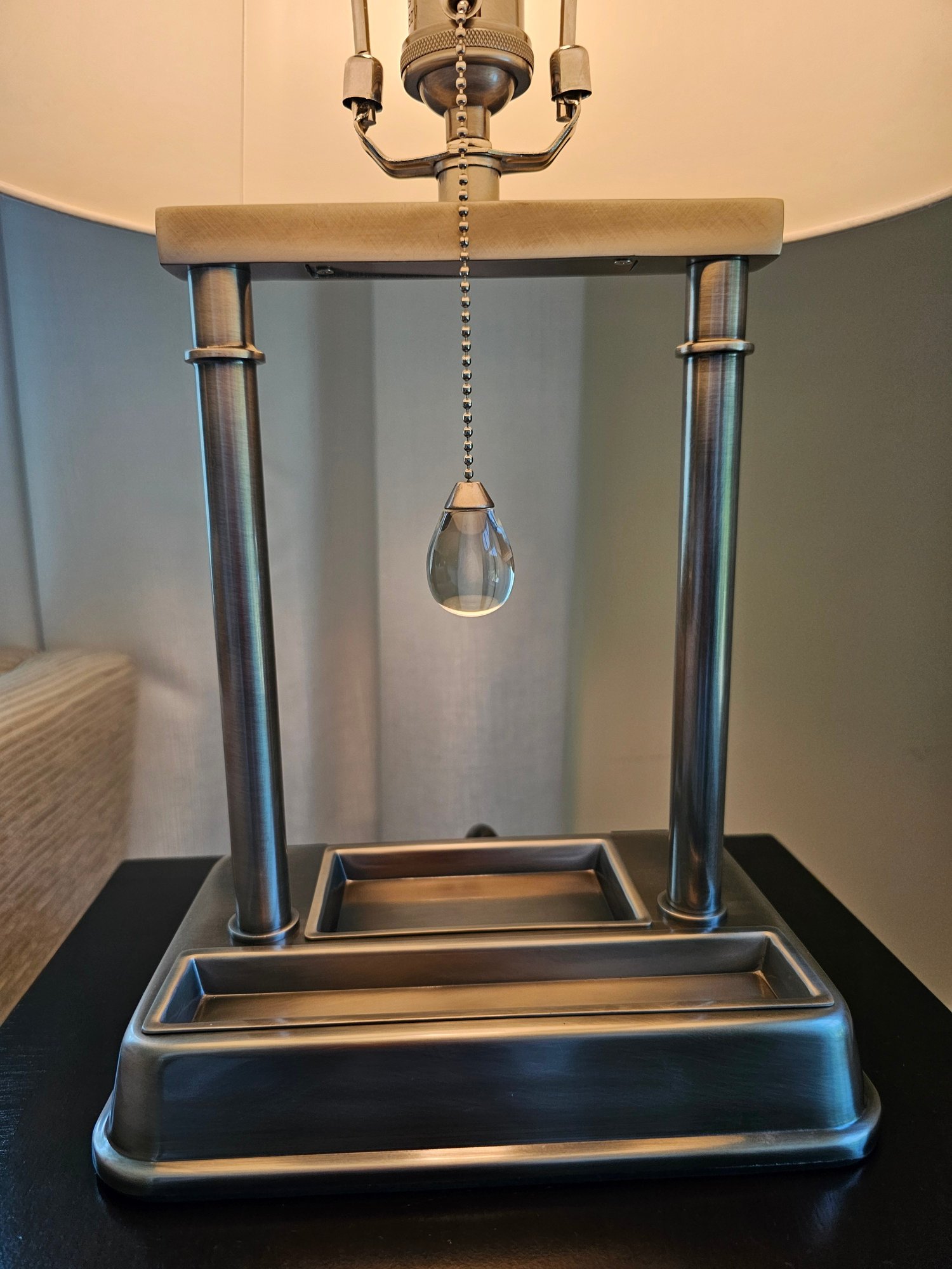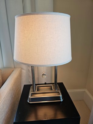 Handsome Desk Lamp with Linen Shade. Has built in charging devices. measures 21 tall 13 diameter shade.