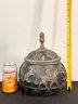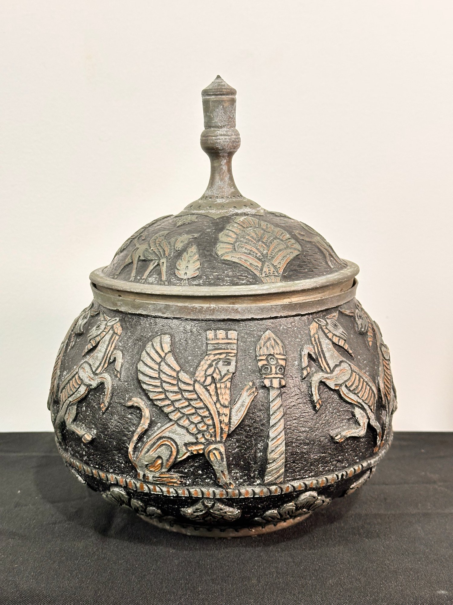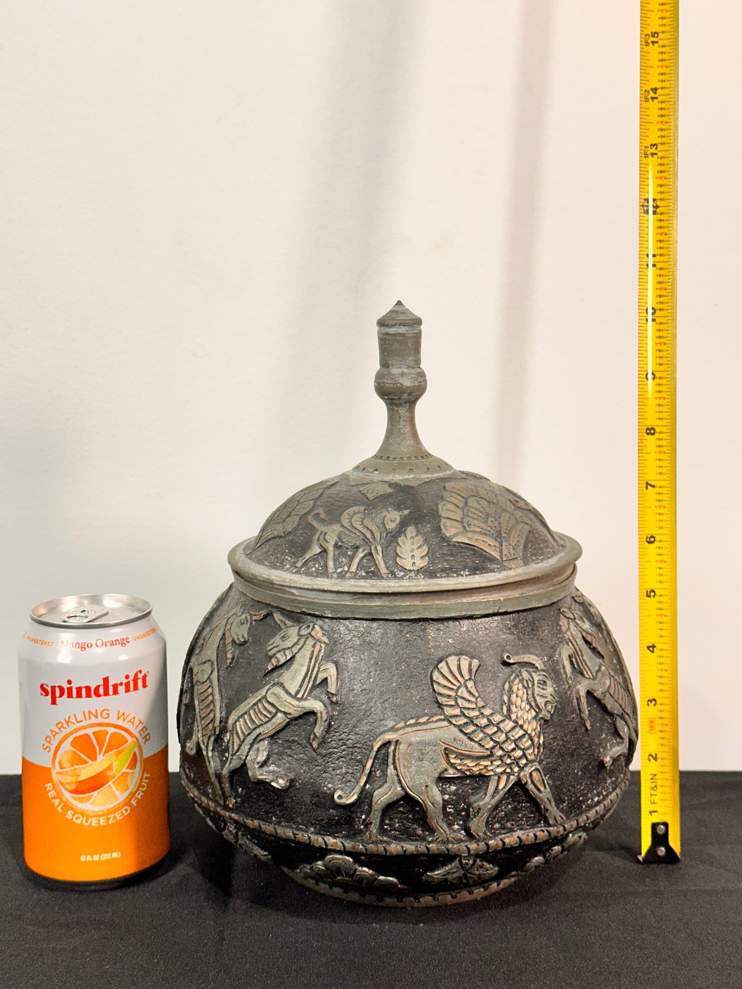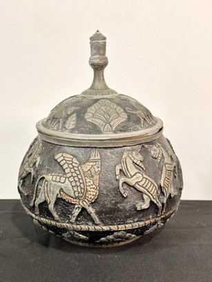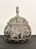 Lidded Metal Decorative Pot, textured finish, possibly aluminum