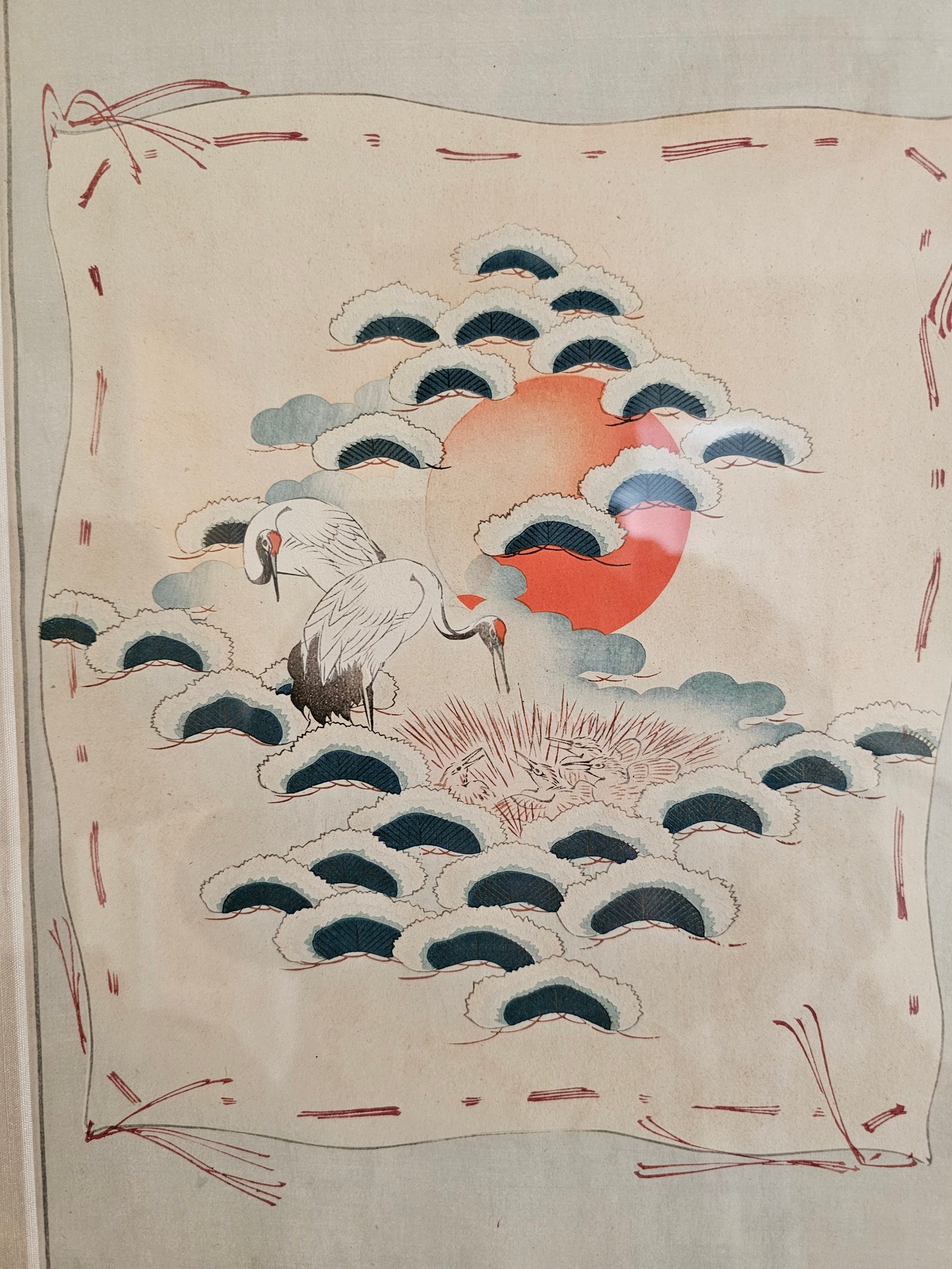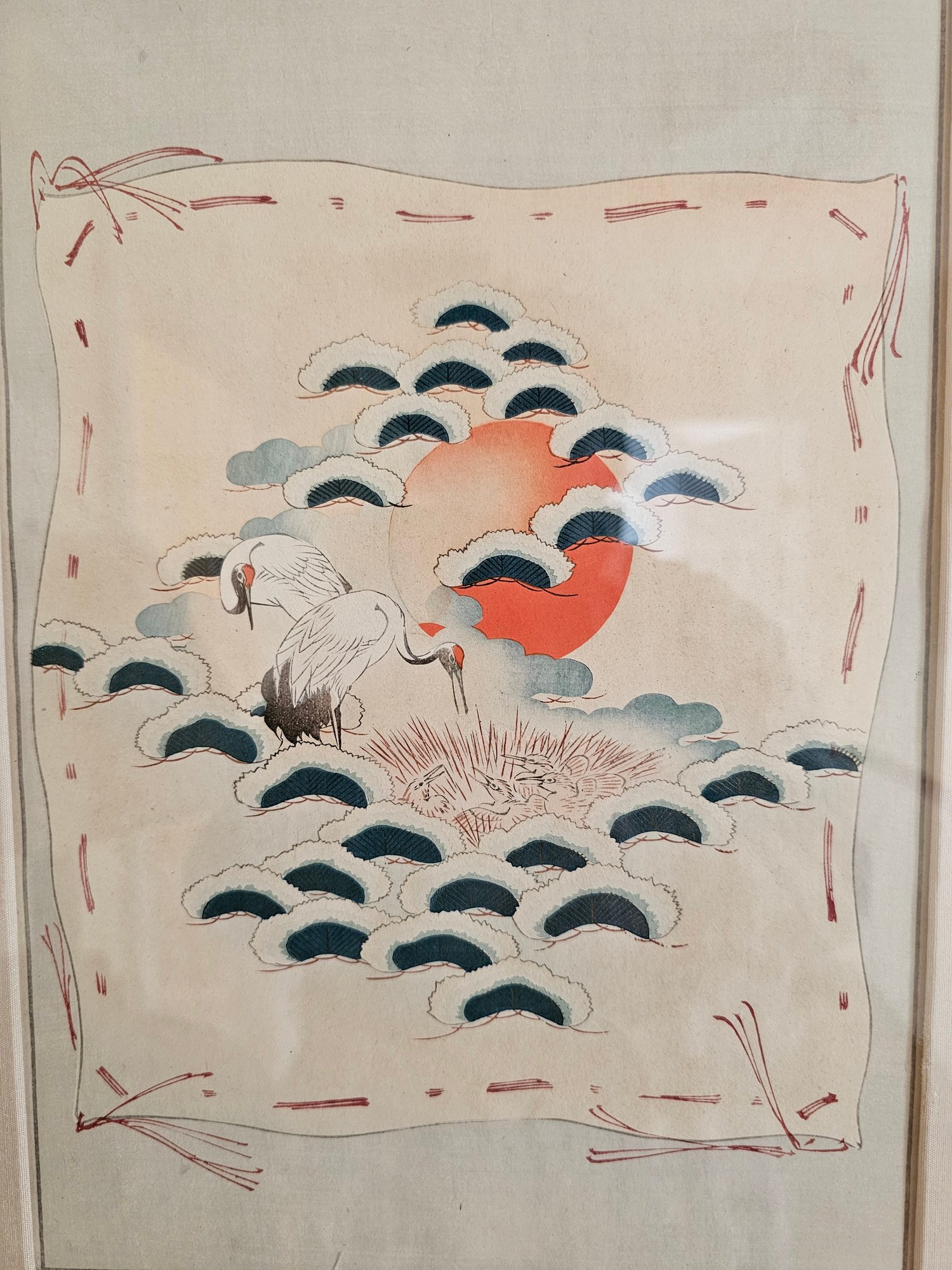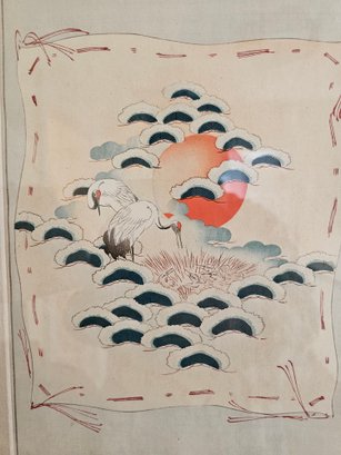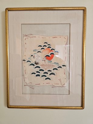 Gilt Framed Vintage Nishiki-e Japanese Polychrome Woodblock Prints (Cranes & Fledglings in Nest, Rising Sun, Pine Tree) Measures 18x14