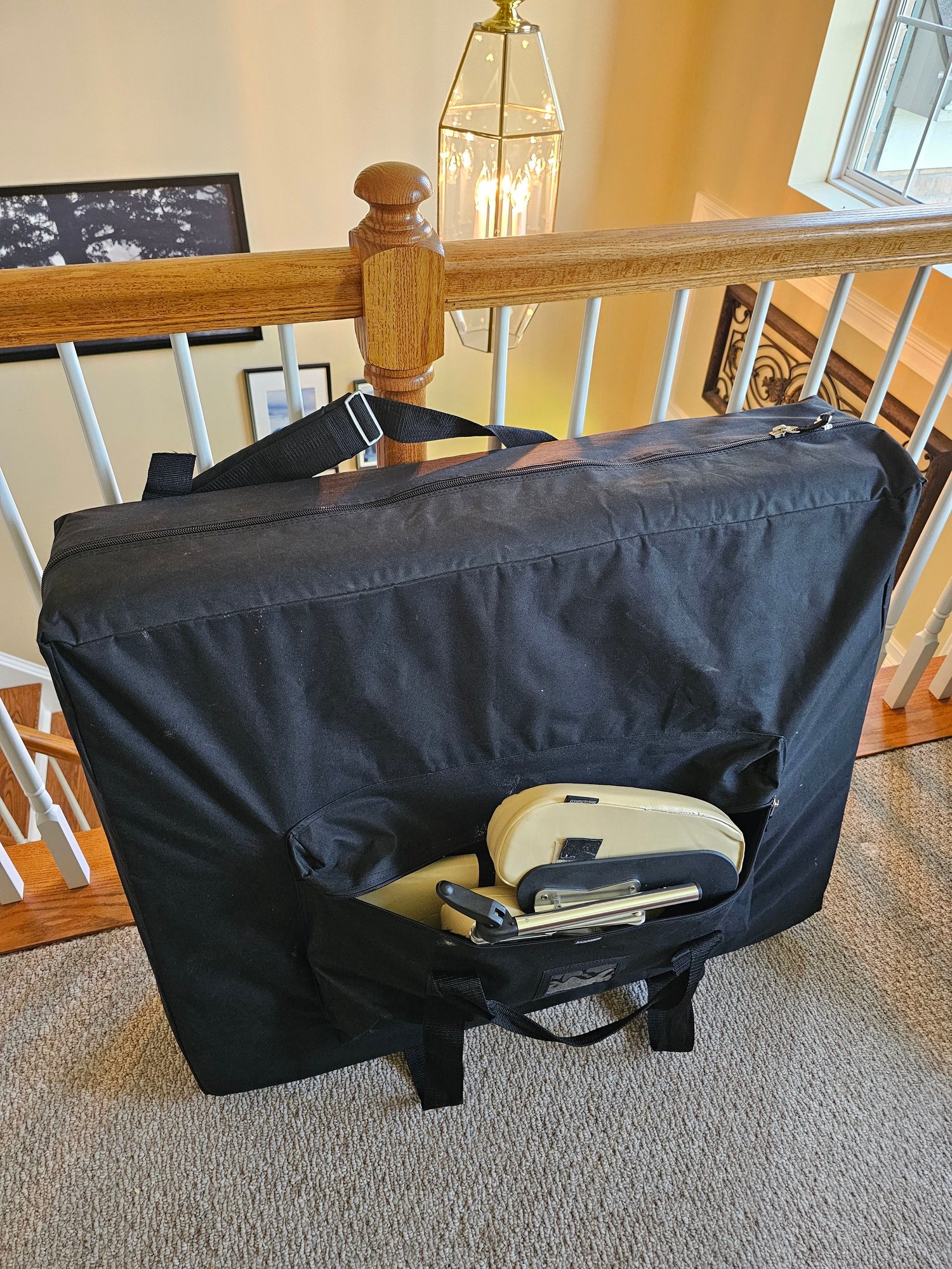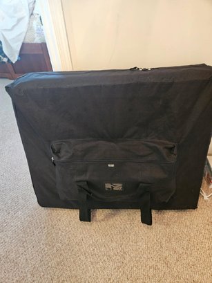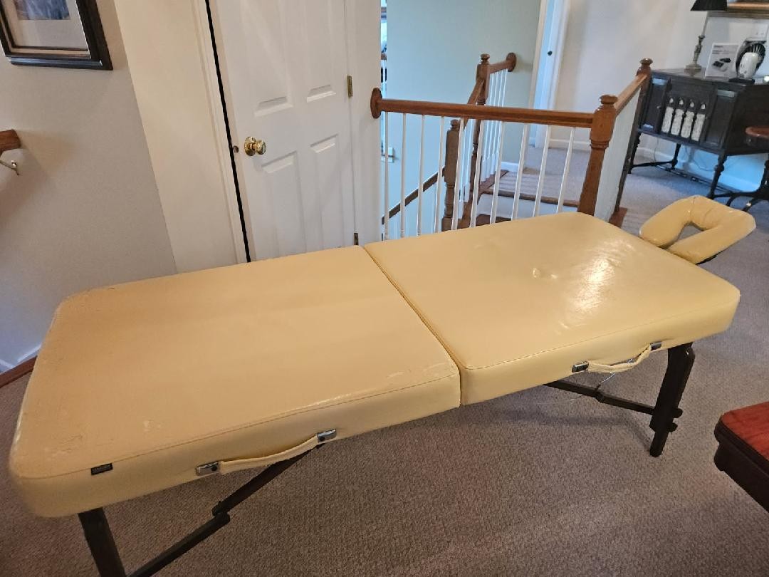 Massage Table with case. Will try to get measurements. Notice the leather is cracking in a few areas on face rest and possibly in other locations. Of course this is covered with a sheet when in use so it's not really a detriment to its purpose.