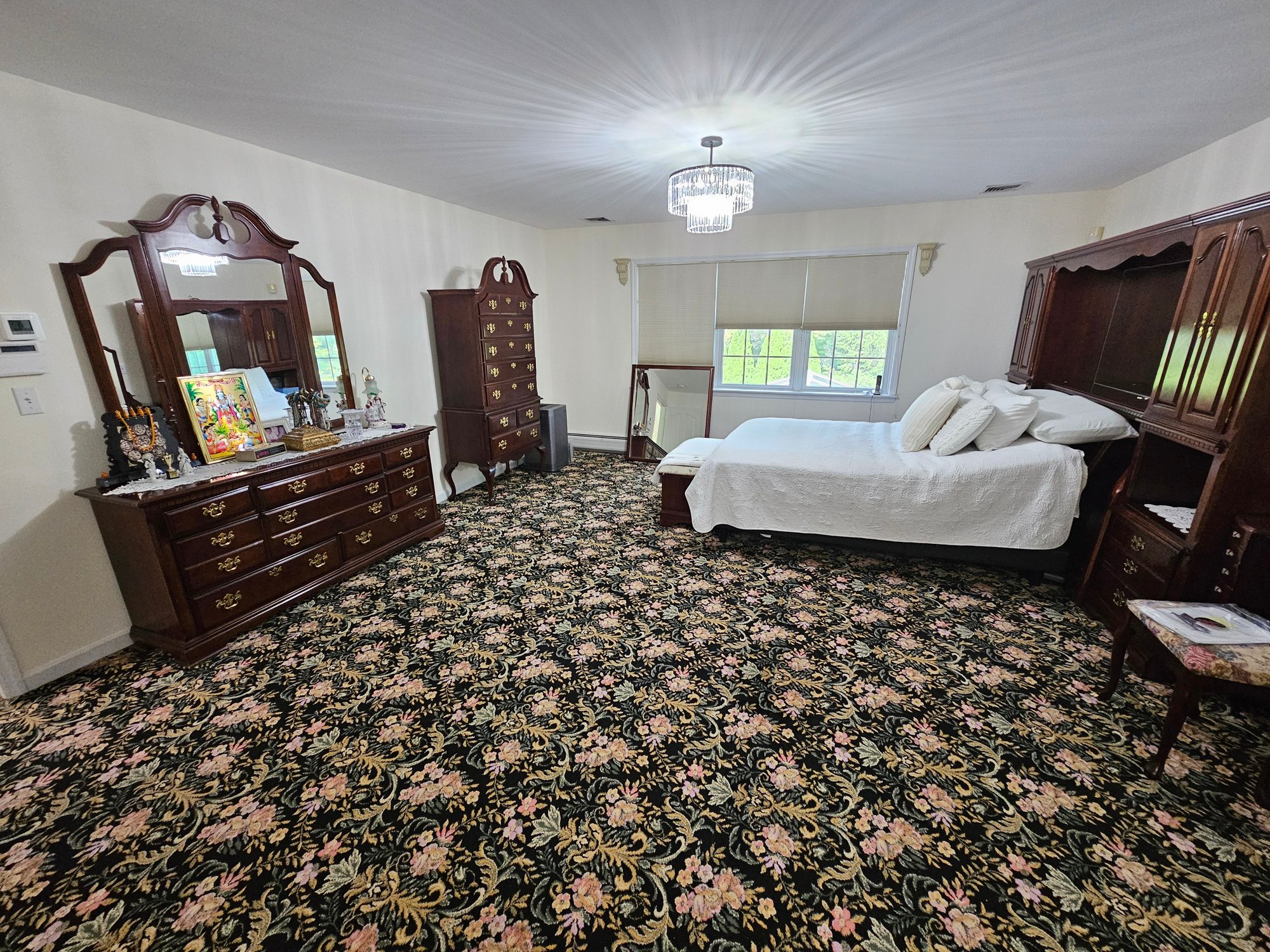 Master Bedroom Power Bed and Surround. Bed works. Bed itself is 60x78. Overall surround looks like three pieces and is 112 wide and 17 deep. Bring appropriate help and vehicle. Highboy is 36x80x18