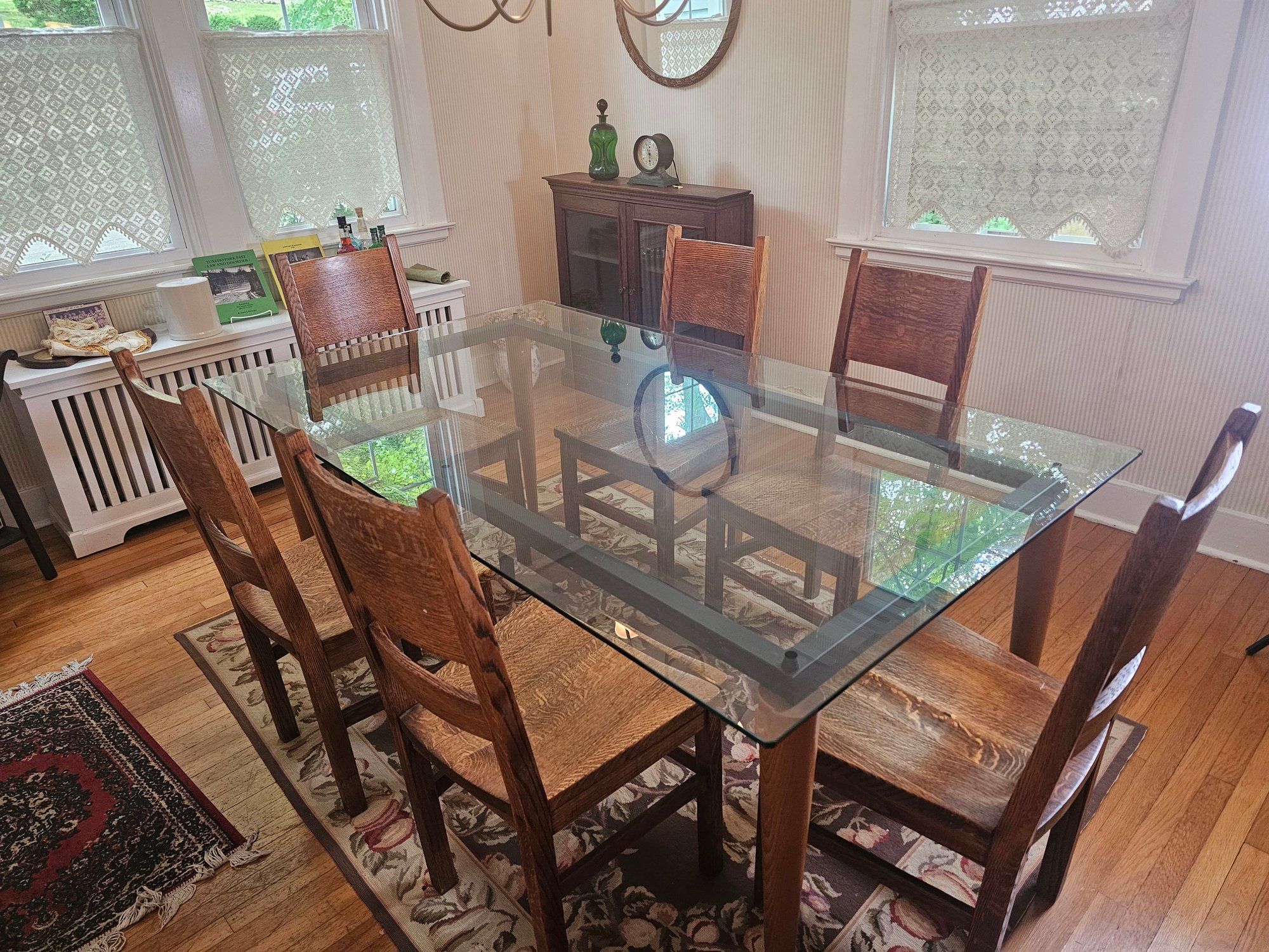Mid-century Style Glass Top Table and Traditional Oak Chairs 42x72x28 3/4. Very light surface scratches on center of table that are difficult to see in person but also in pictures. Chairs are 18 x38 x16