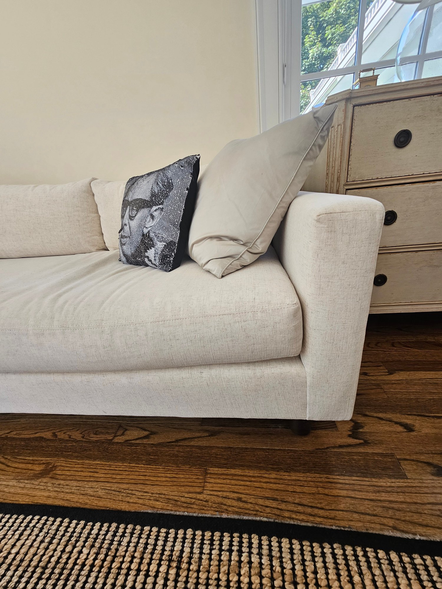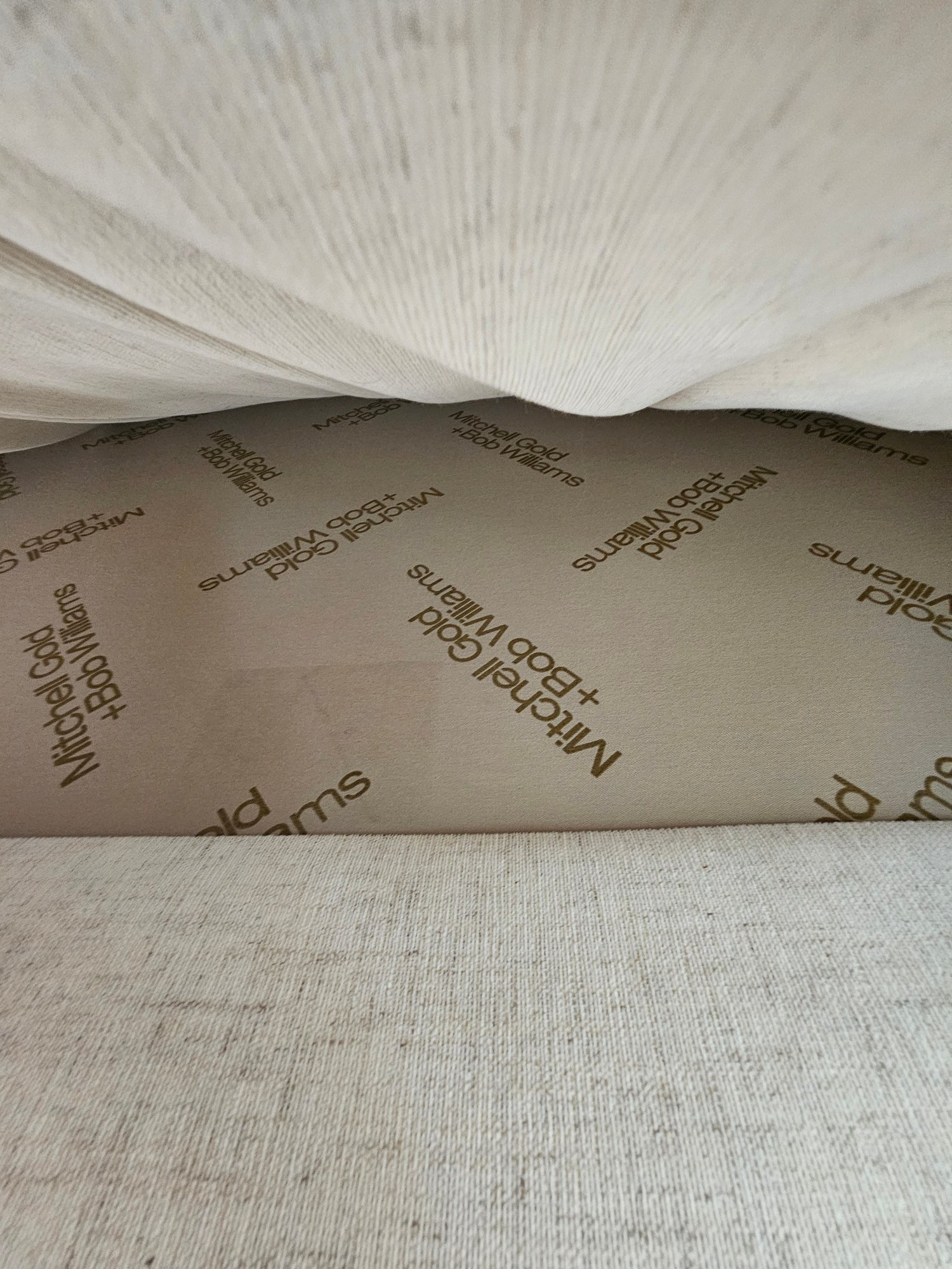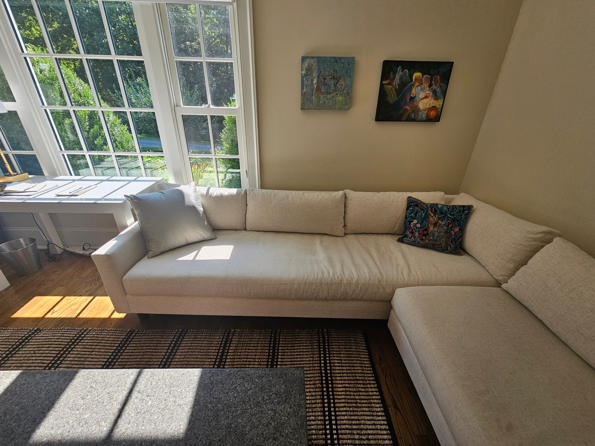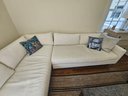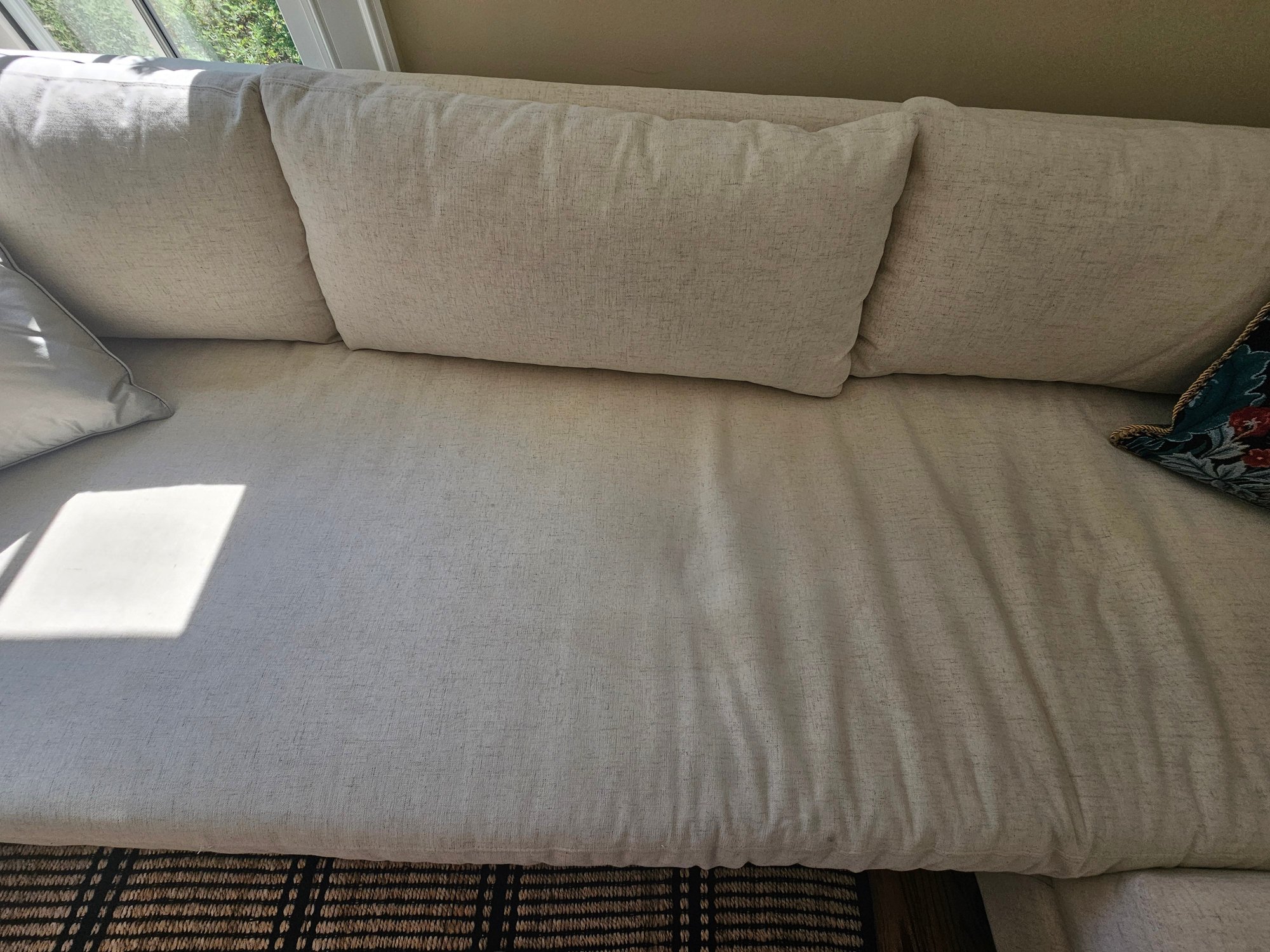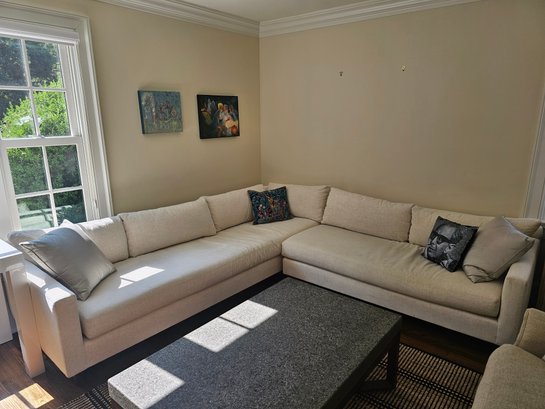 Mitchell Gold & Bob Williams Sectional Sofa, measure 105x105 27T and 38 deep. Please examine the photos closely with the zoom function. It appears in the section below the window there is a stain. It's faint but a stain exists