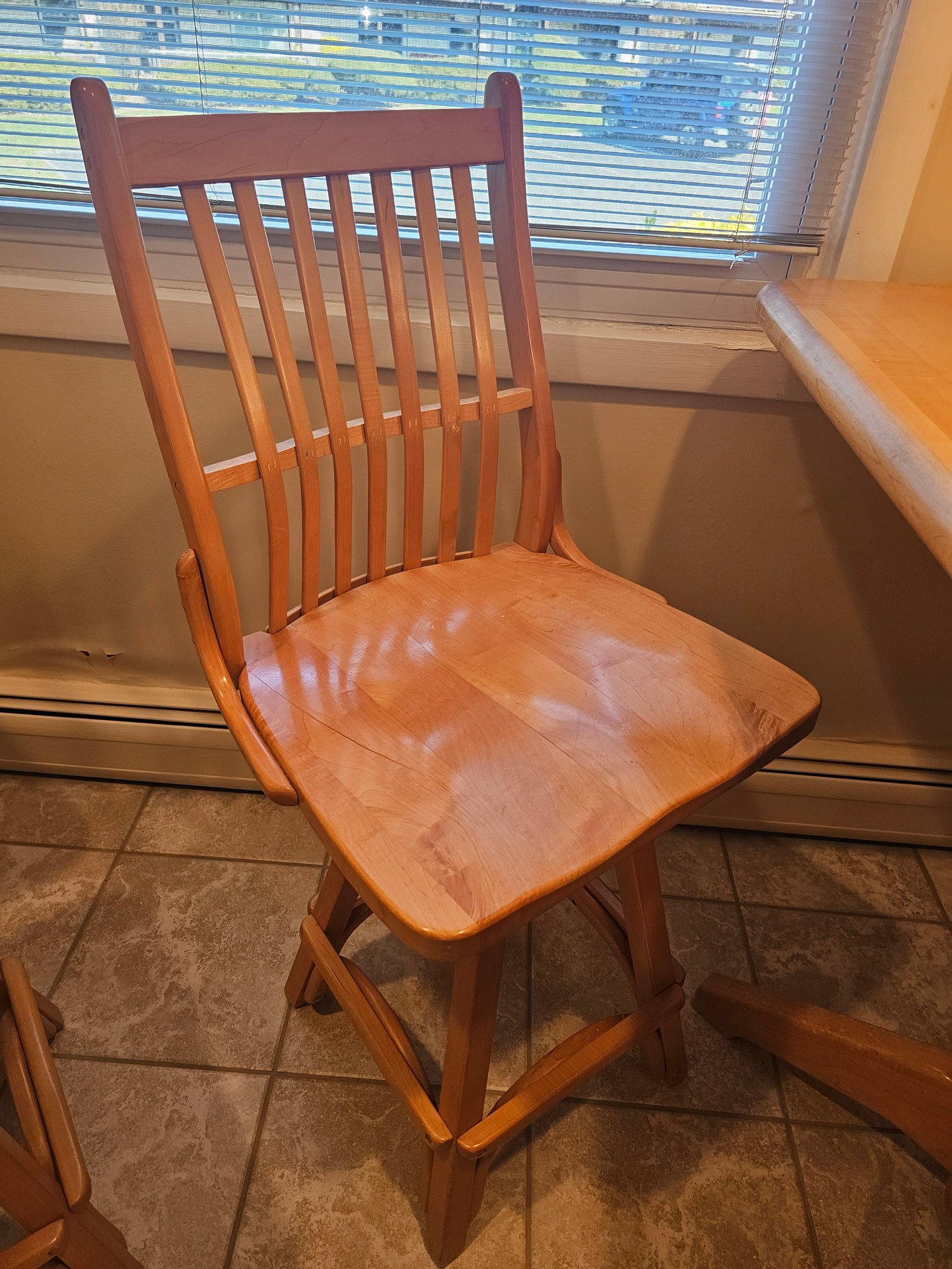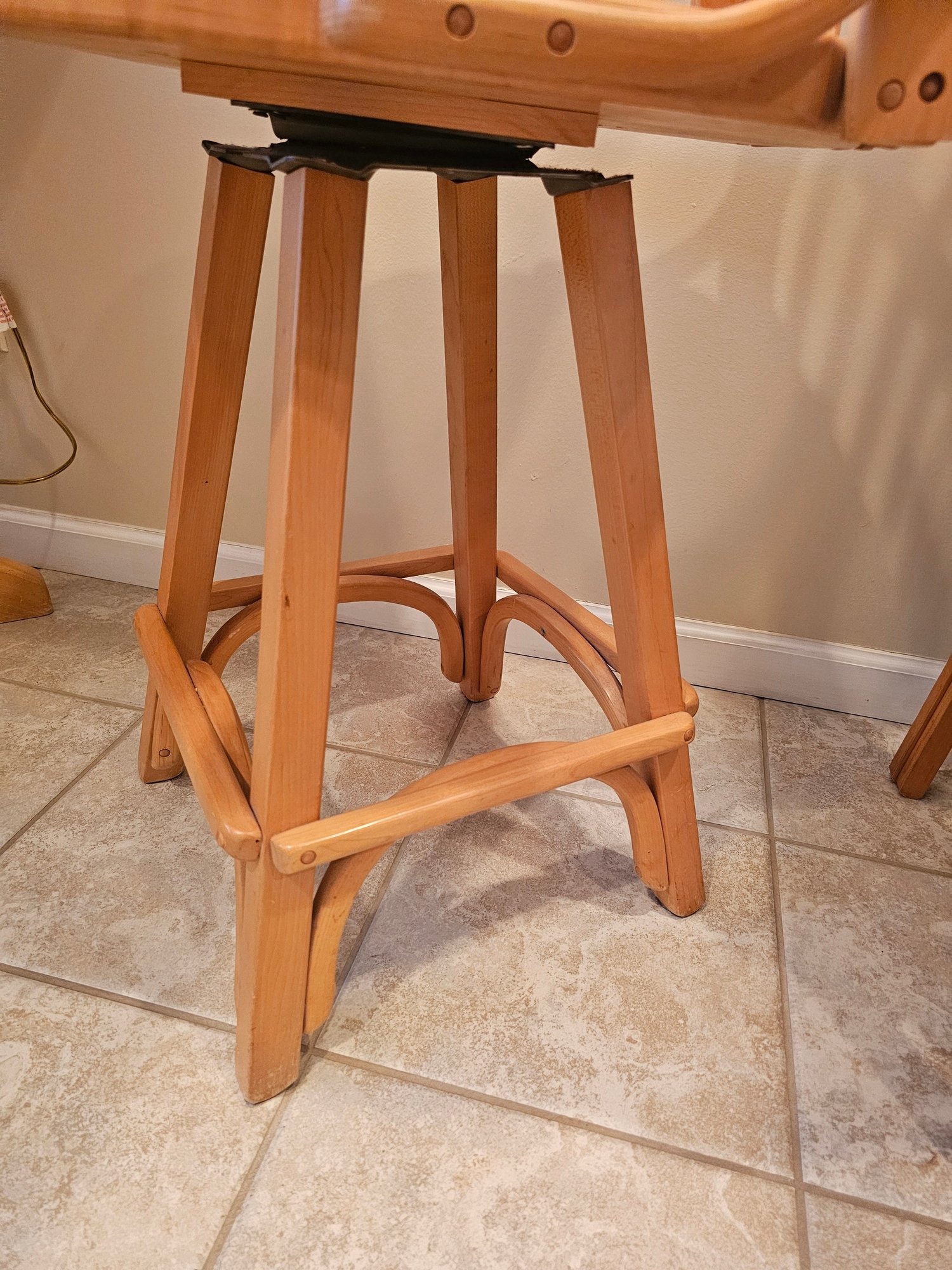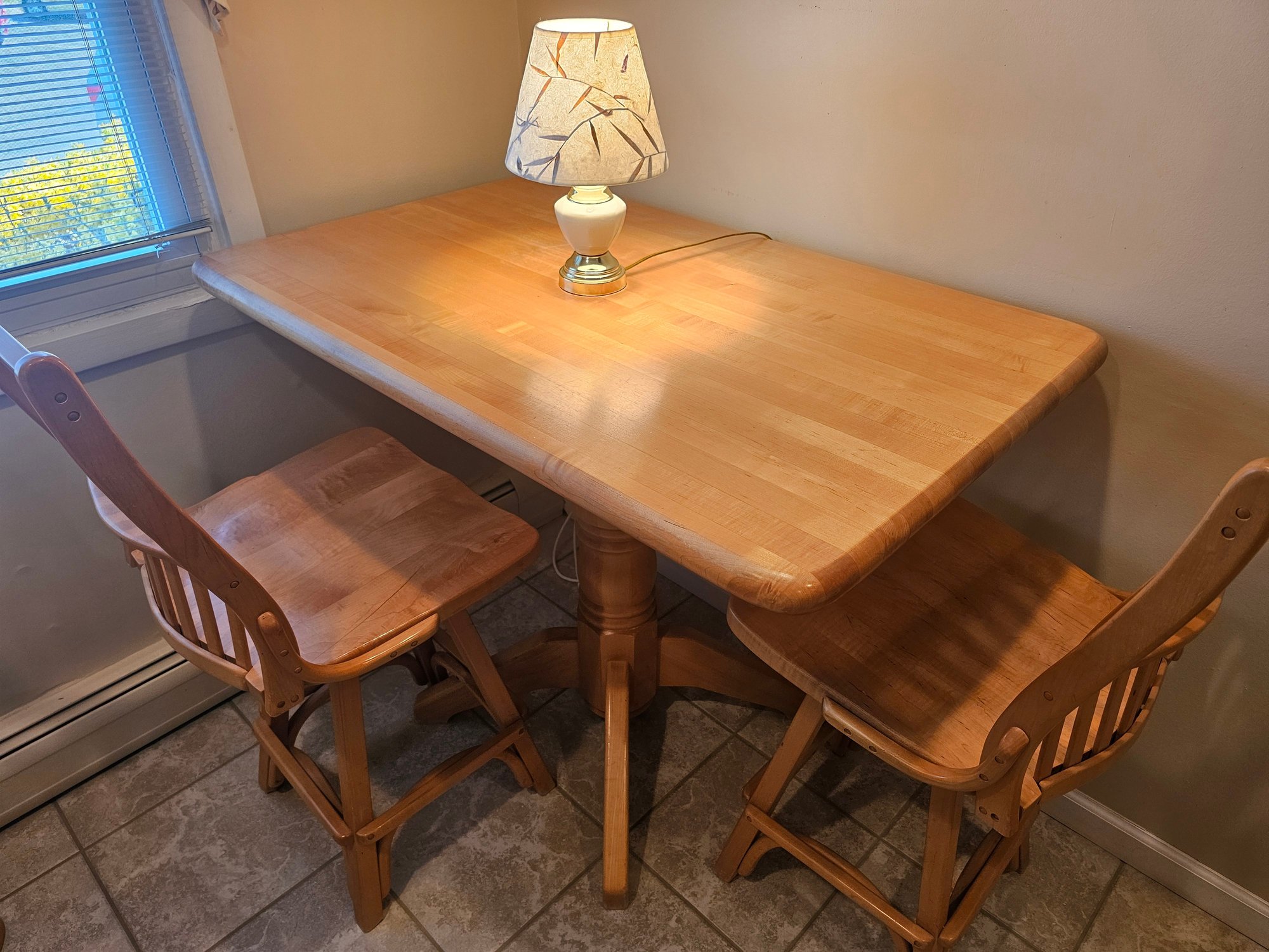 Oak Hightop Table and 4 Chairs. table is 48x30x37 and chairs are 19x17x43 with a seat height of 25, Seats swivel