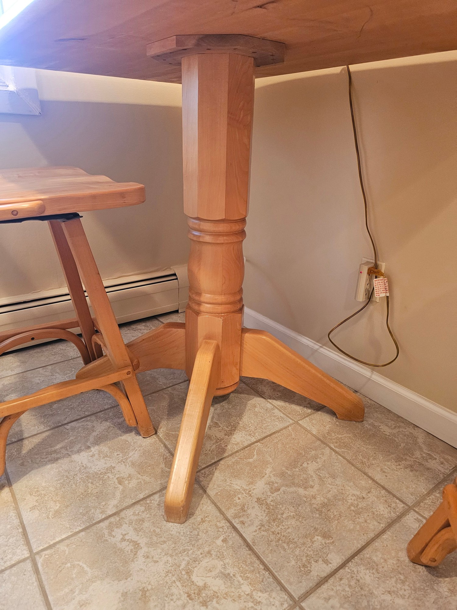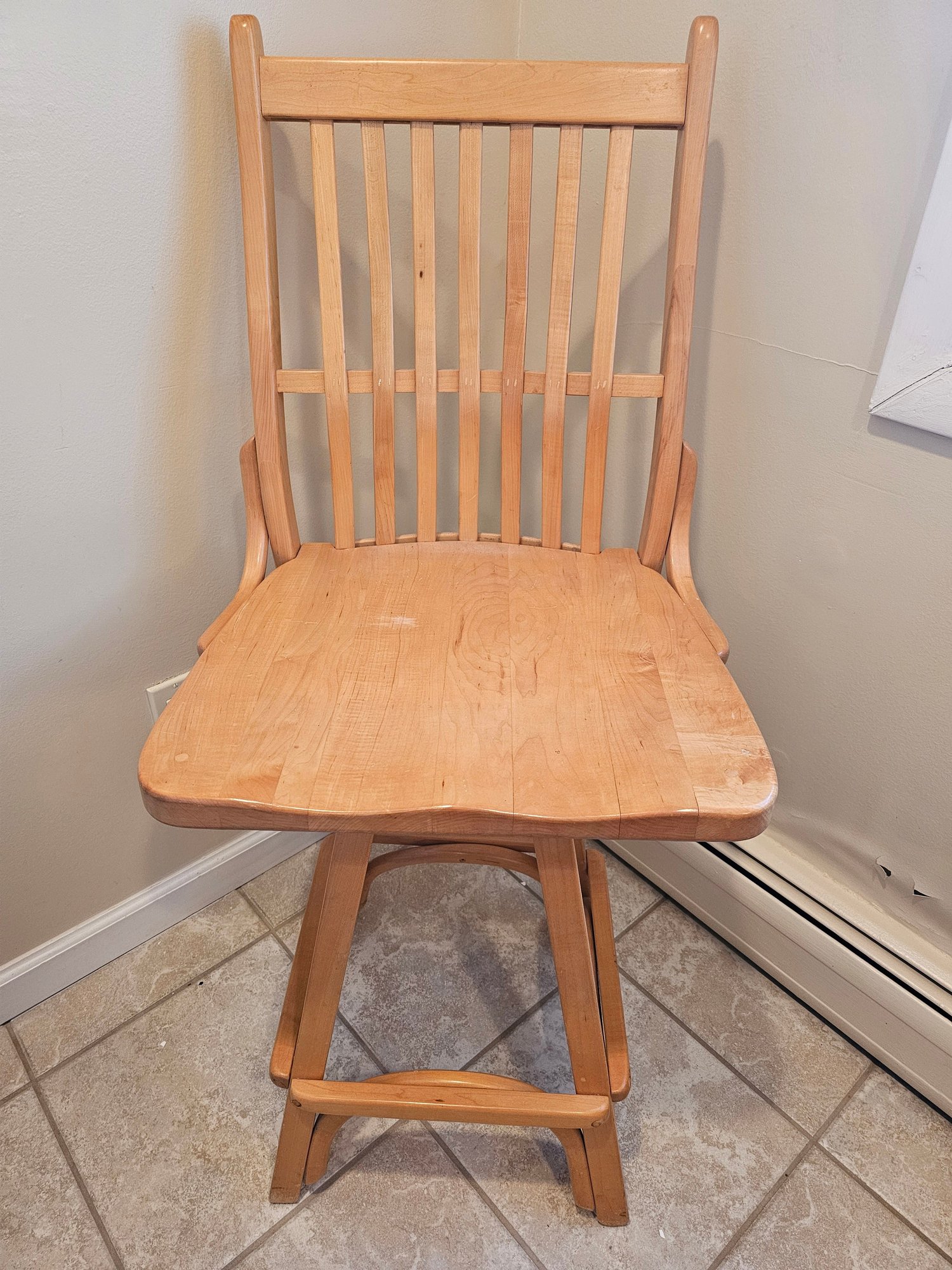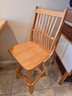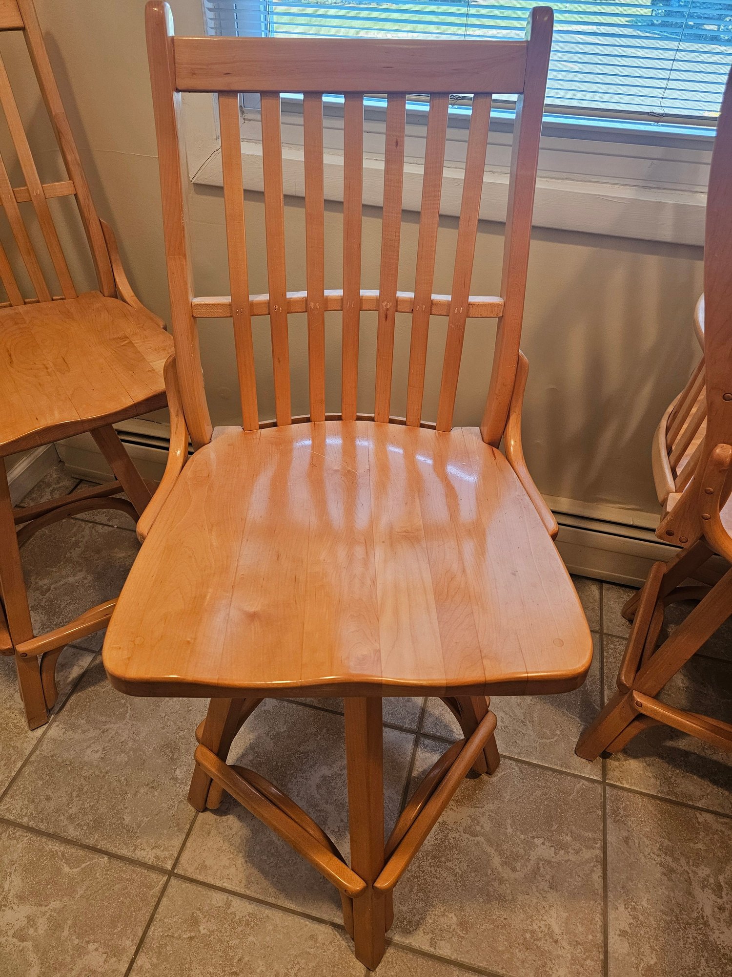 Oak Hightop Table and 4 Chairs. table is 48x30x37 and chairs are 19x17x43 with a seat height of 25, Seats swivel