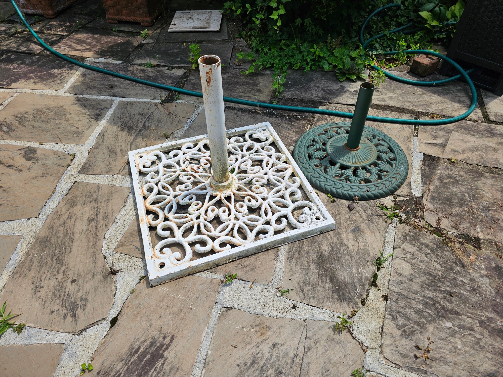 Older Large Umbrella Base along with a newer traditional Base, old one measures 24x24