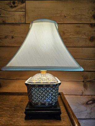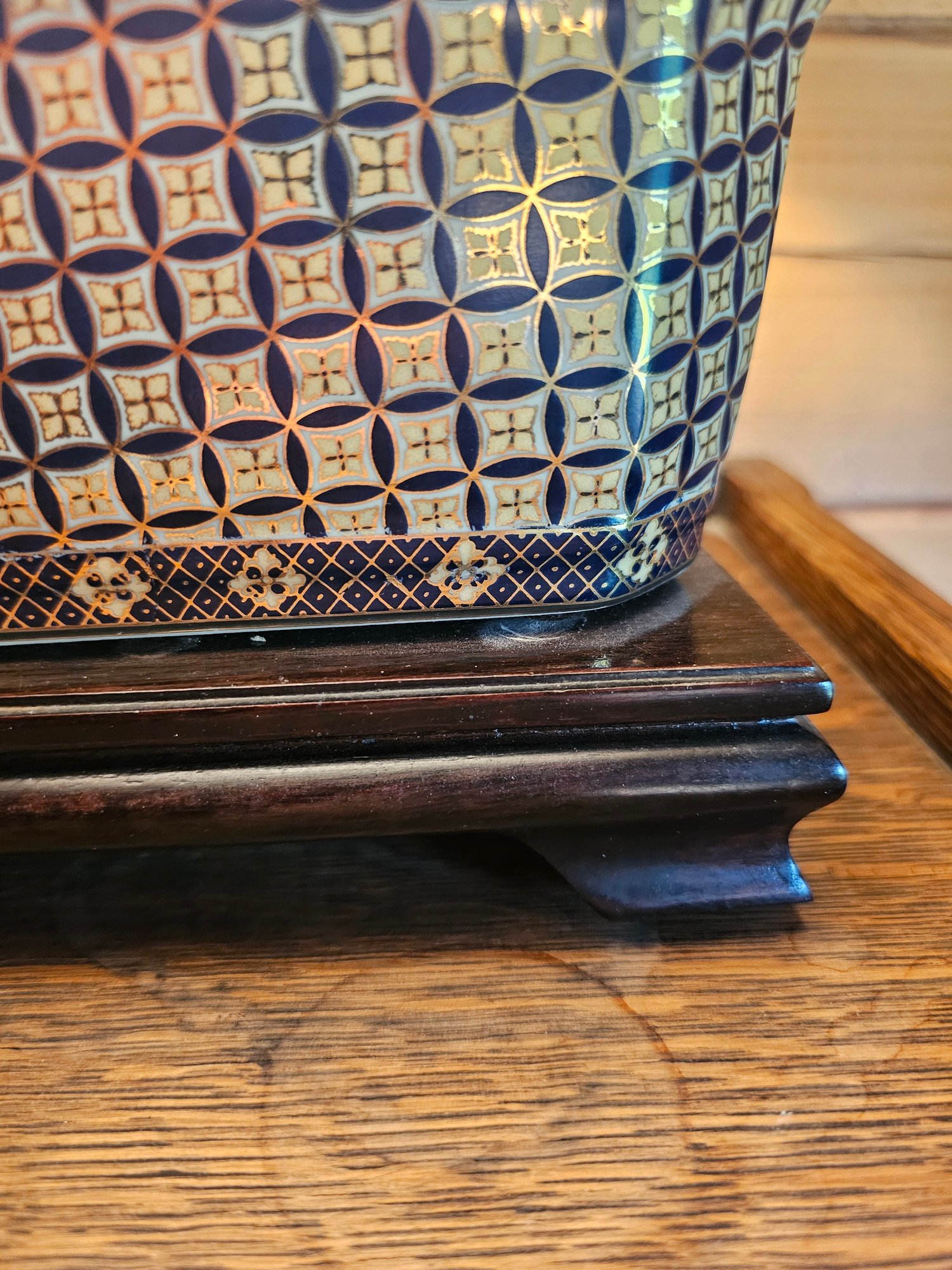 Porcelain Box lamp 16x11. Porcelain slightly coming away from the wood base but does not impact its appearance or functionality