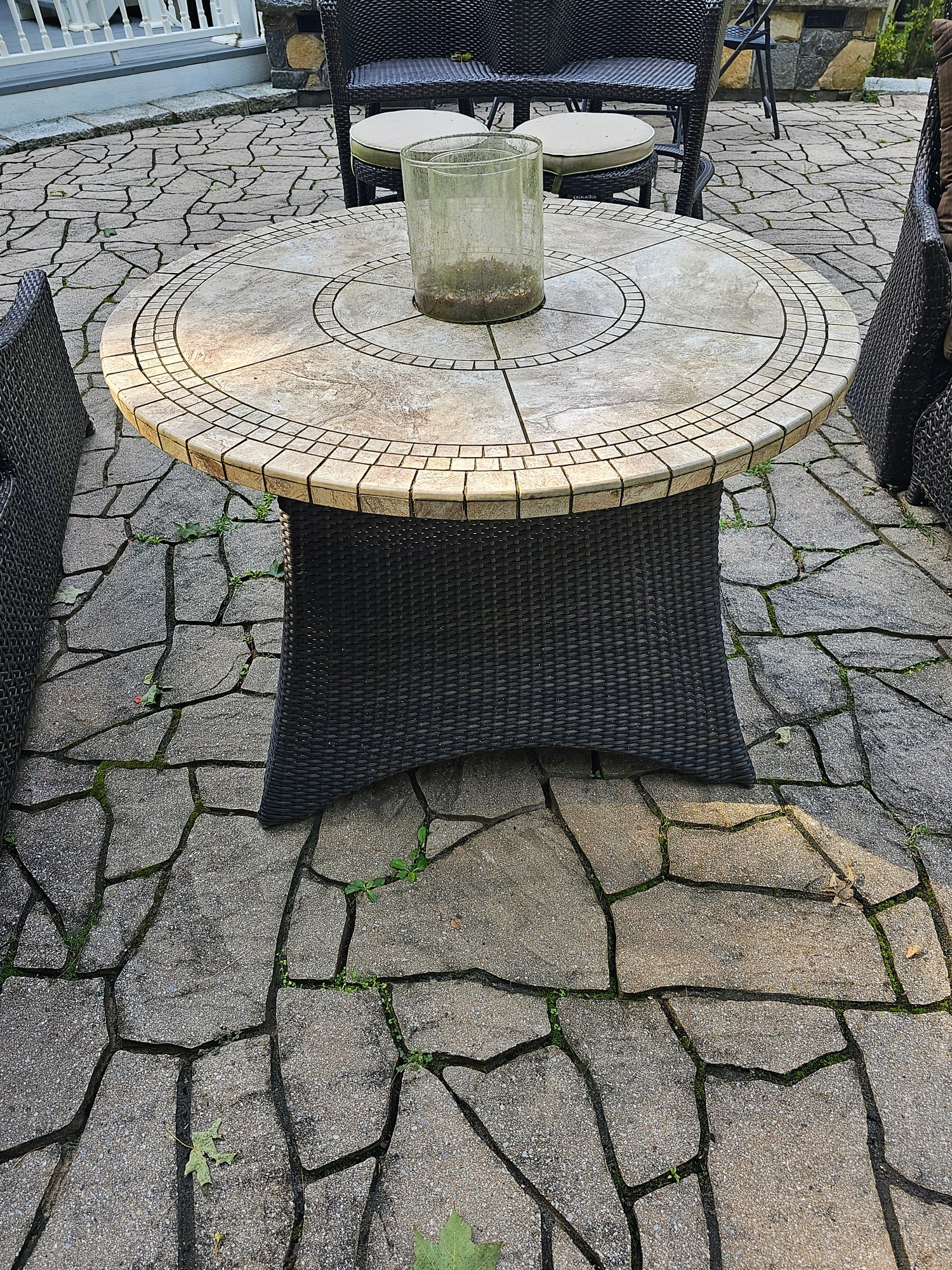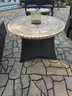 Outdoor Frontgate Fireplace Table. it is 28 tall and 44 in diameter. There are 11 loose tiles on the top that need to be reattached. One minor flaw in vinyl wicker.