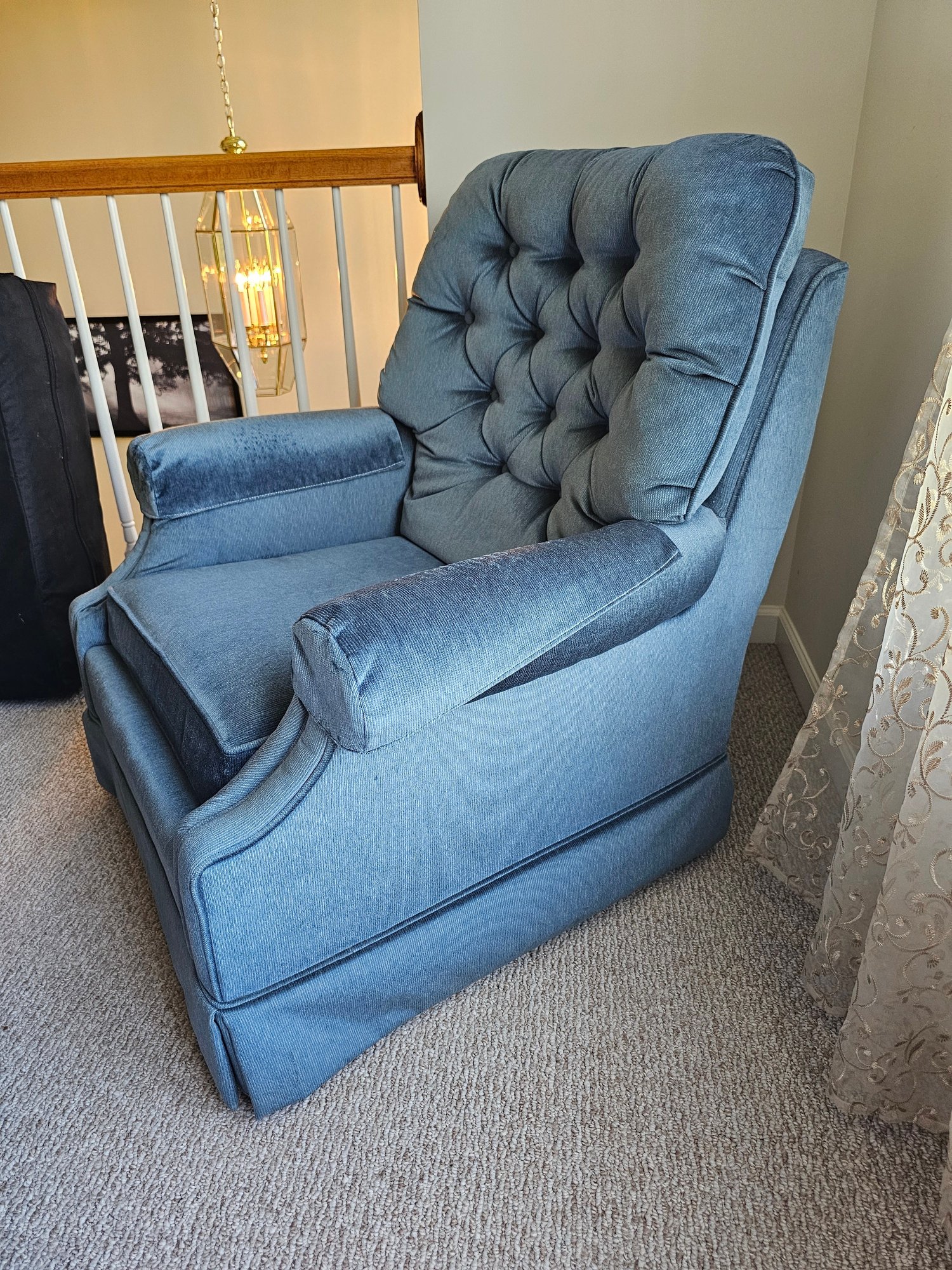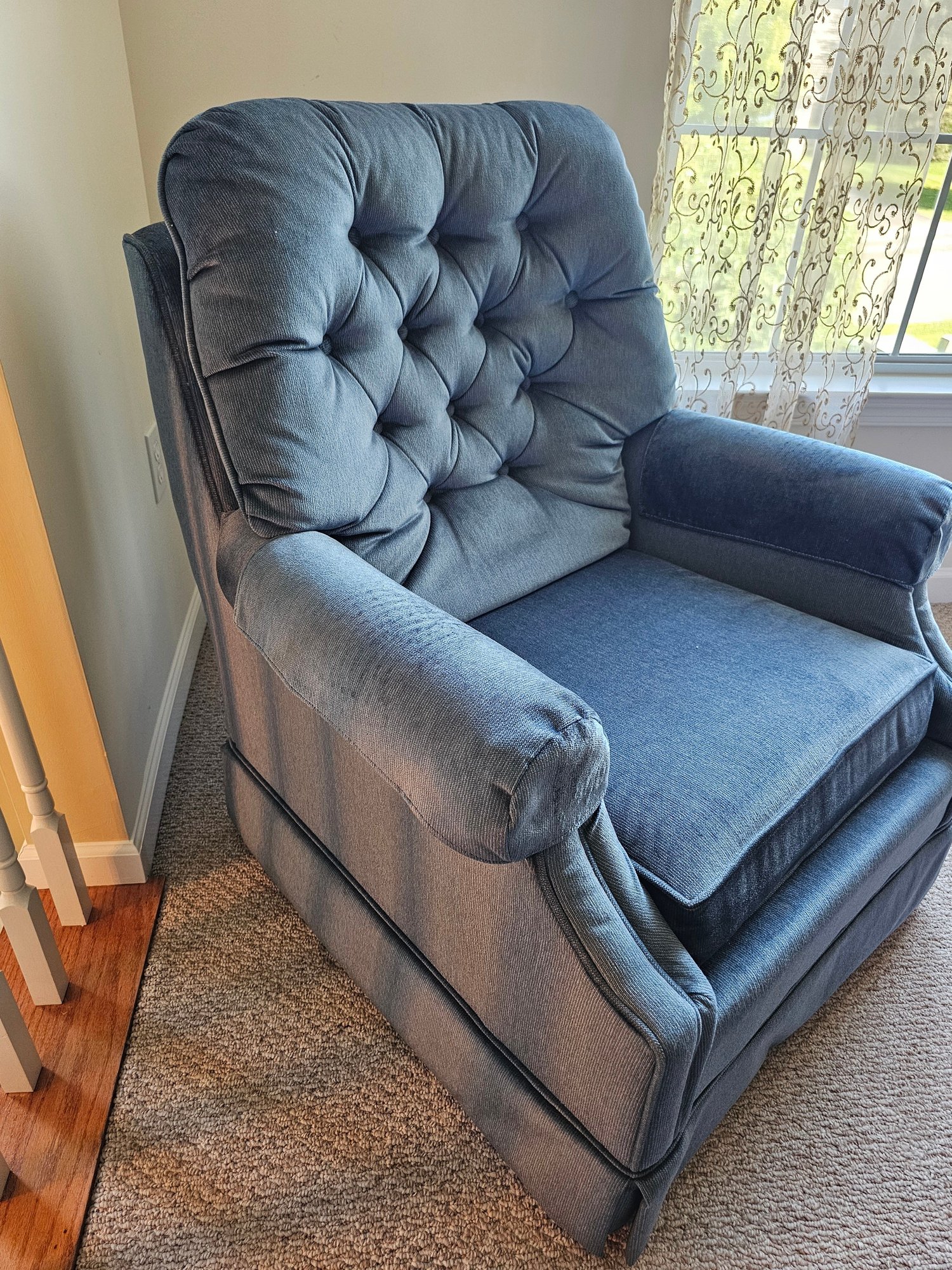 Really Comfortable Chair. Does not swivel or recline. Immaculate pet and smoke free home