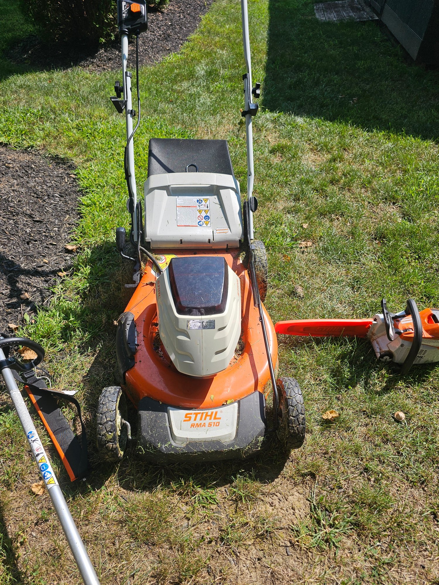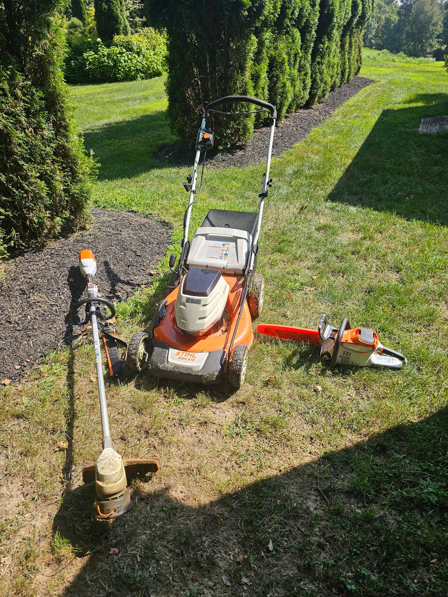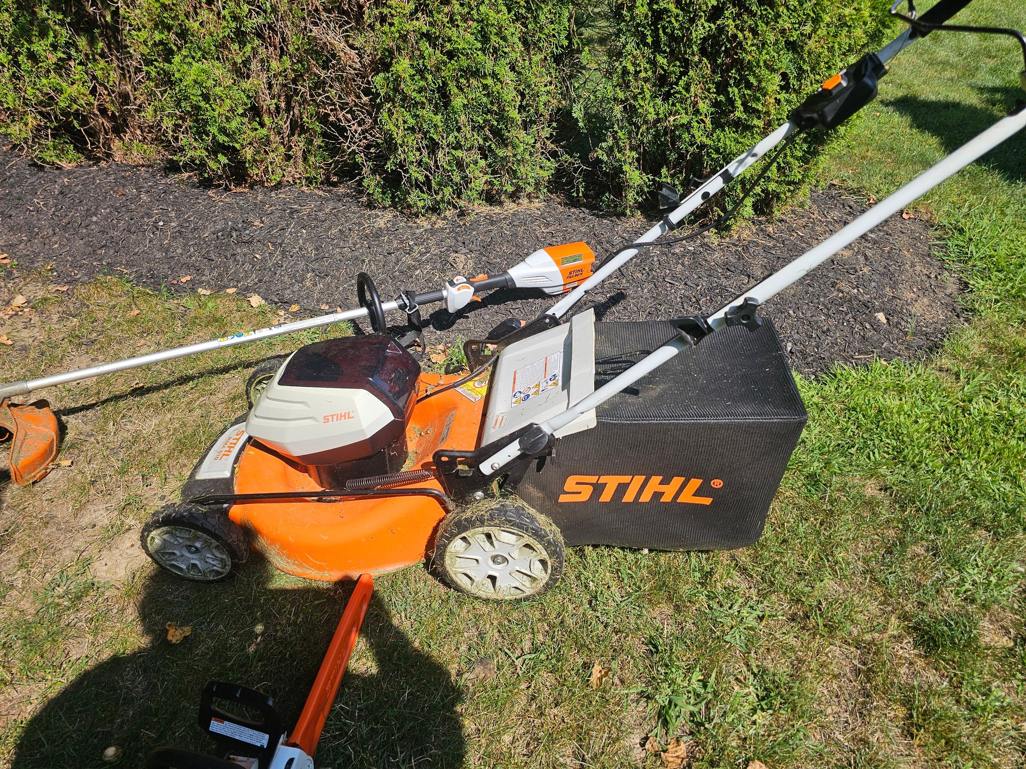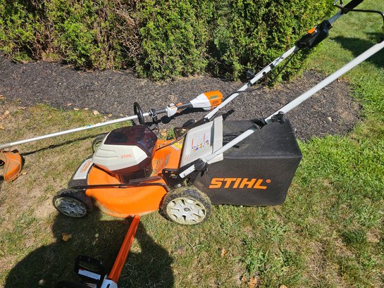 Group of Stihl Battery Powered Garden Tools (mower, trimmer and chainsaw)