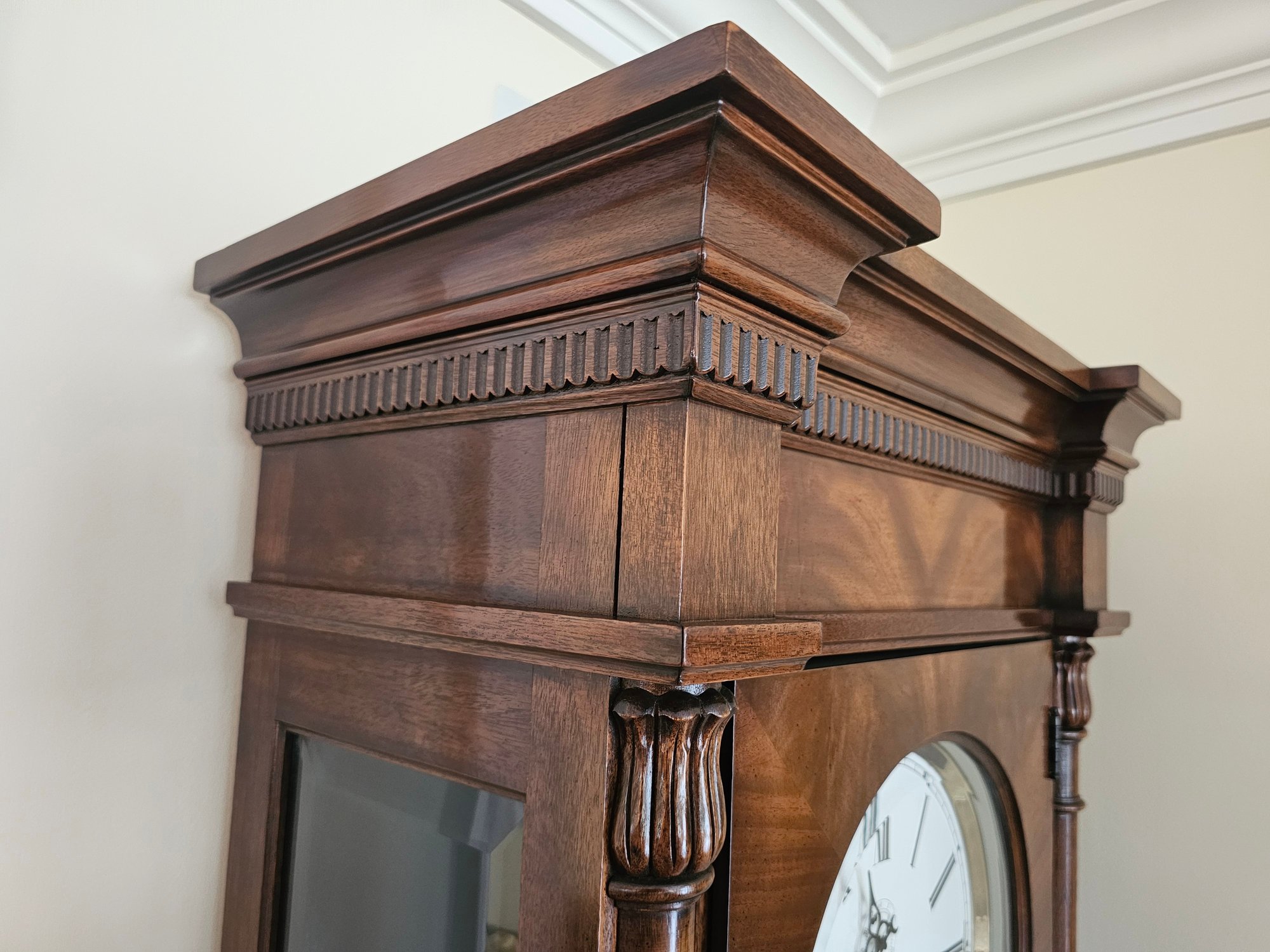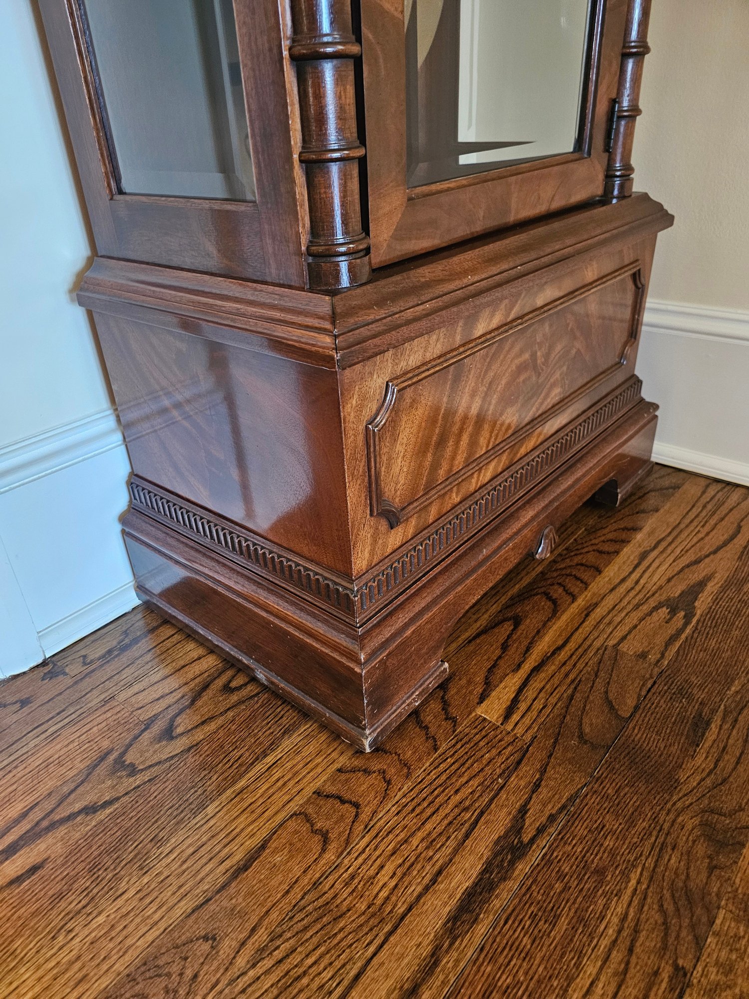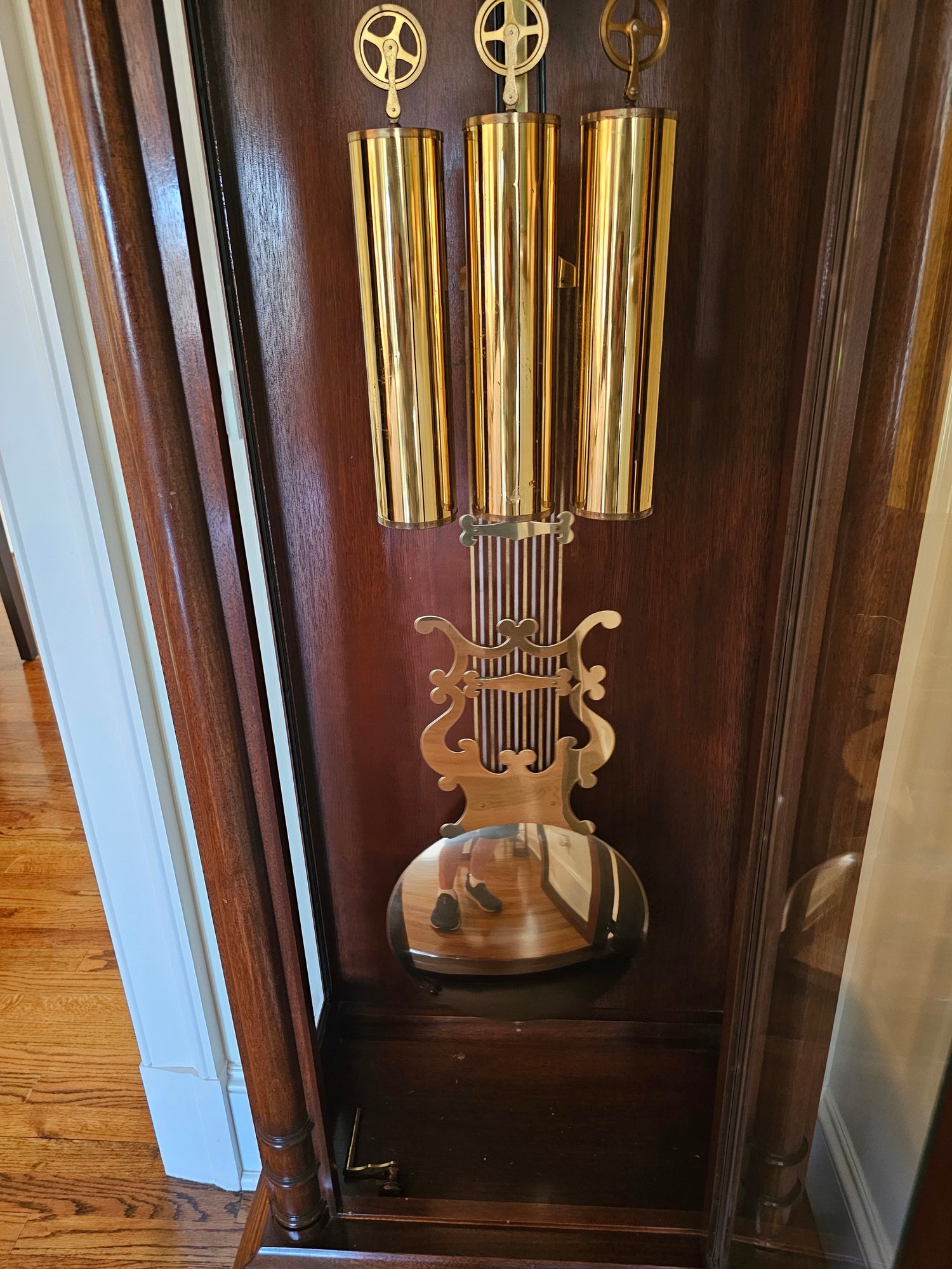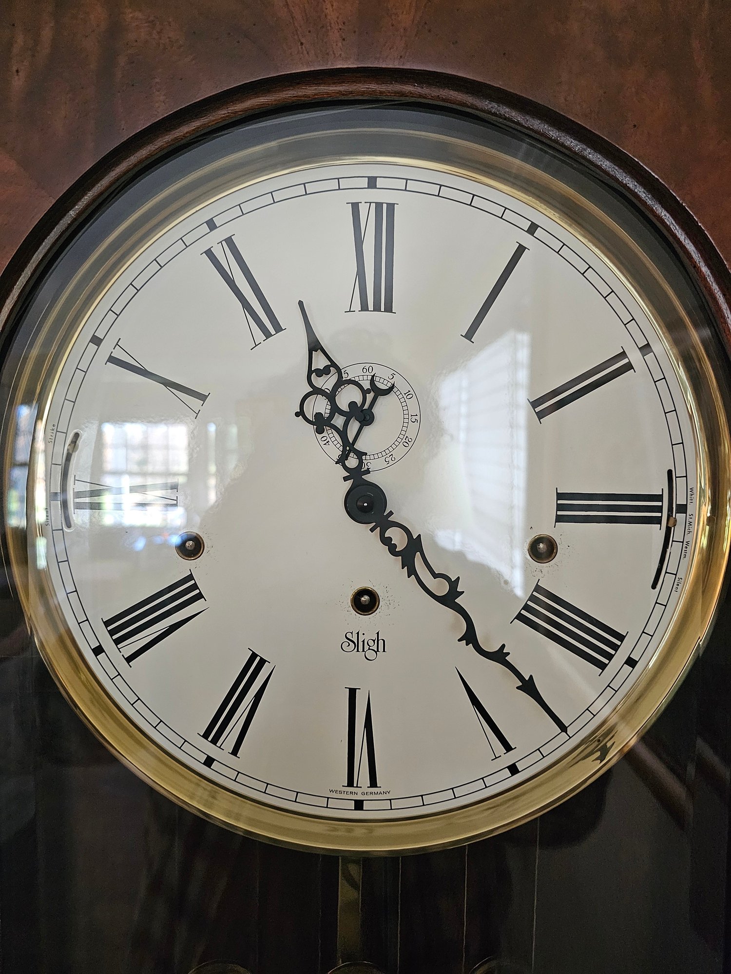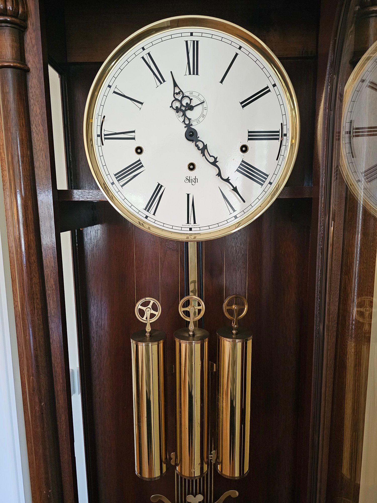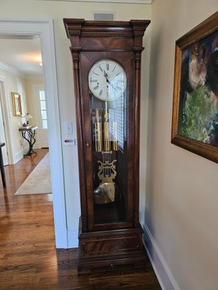 Sligh Grandfather Clock This is a timeless beauty. It works and chimes beautifully. Sligh clocks are known for their quality and craftsmanship. It measures 24x13x80.