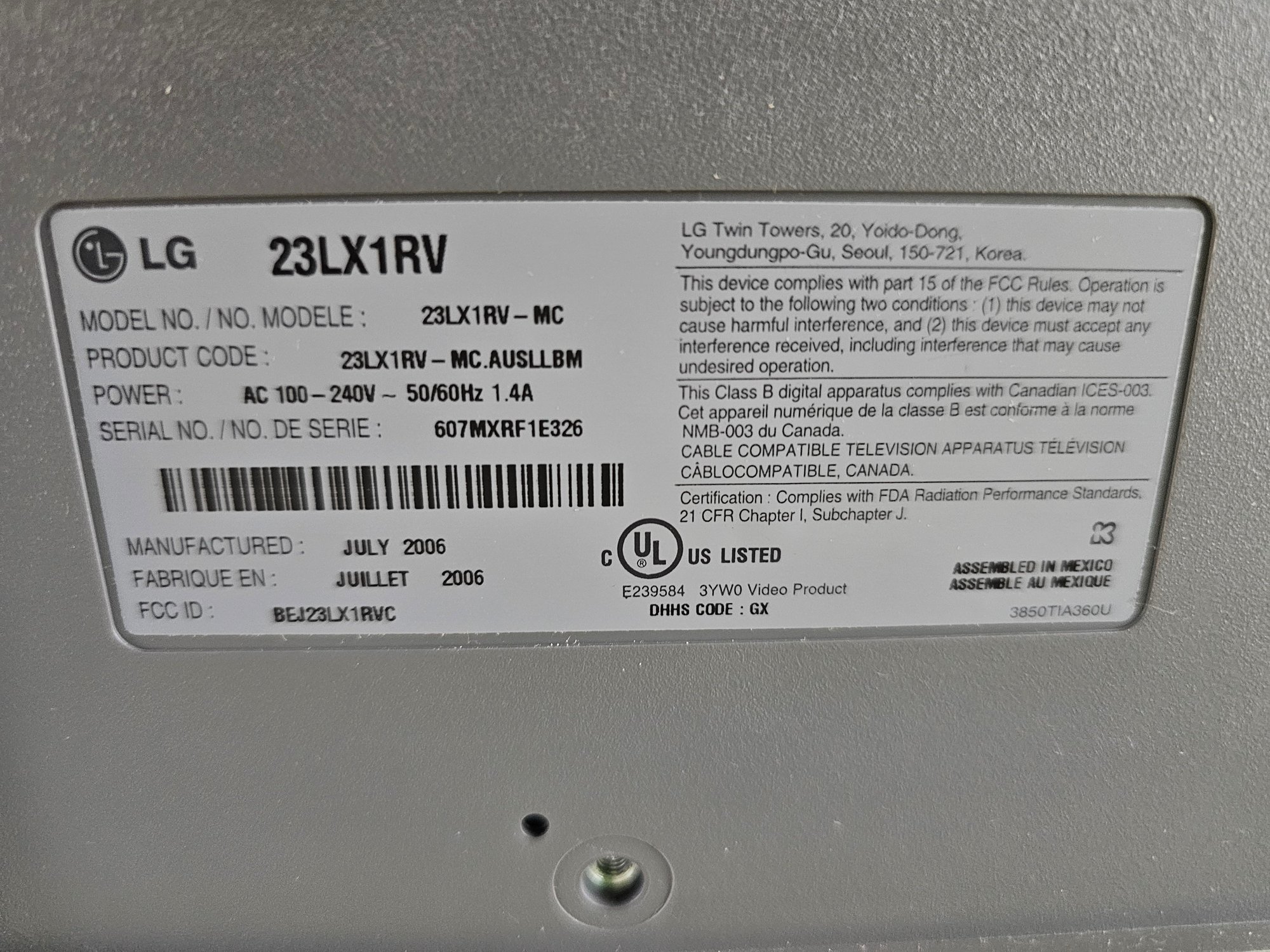 Small LG TV with remote model 23LX1RV
