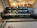 Stadium Style Seating Couch, notice tear on front. A second end piece (not pictured) similar to the wedge shape on the right side is also included. measures 128 across plus additional end piece.