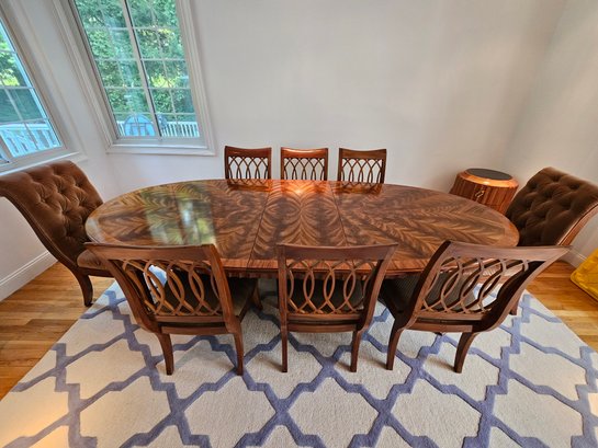 Stunning Dining Room Table And Chairs measures 109x50 which is inclusive of one leaf with a 20 inch leaf in the photograph. There is a second 20 inch leaf. Includes two tufted head chairs and six other armless chairs. Beautiful wood grain. made in North Carolina by Lexington Home Brands