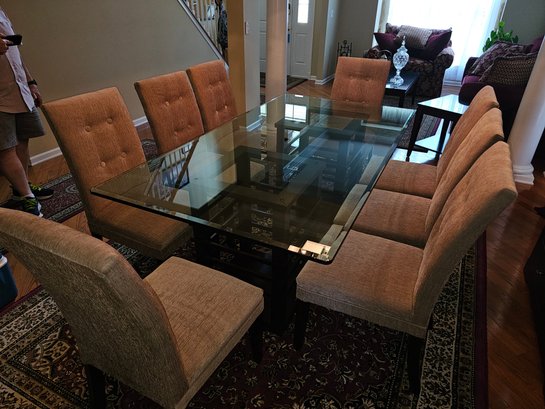 Glass top is 3/4 inch thick and measures 78x42x30 1/2. There are 8 chairs, all of which were inspected and no blemishes were observed. Chairs are 21x19x40