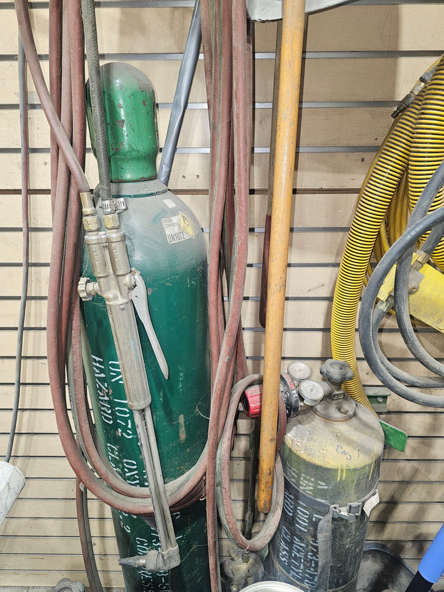 Three Bottles of Gas and connected Gauges and Hoses. Unsure if any gas inside.