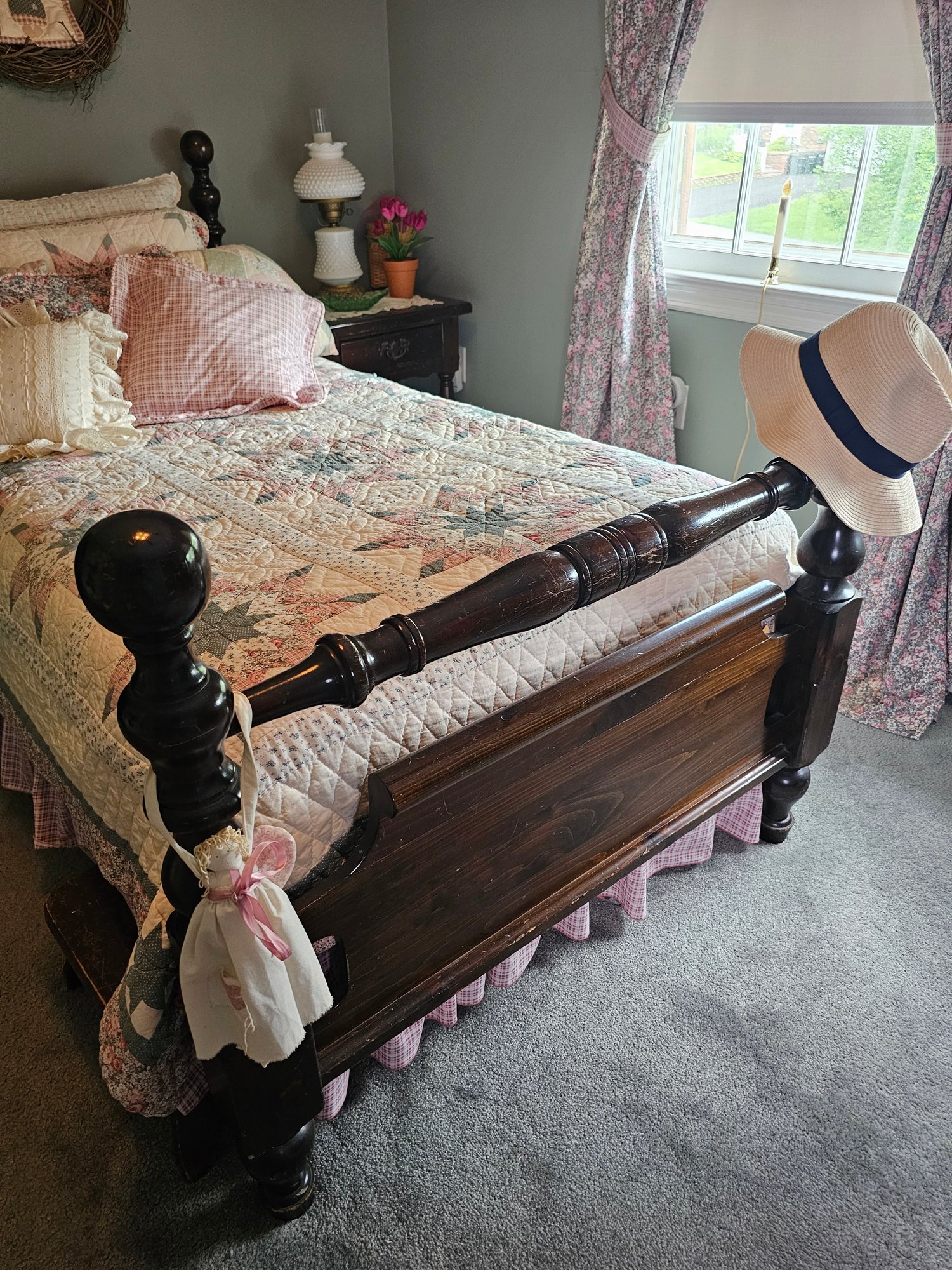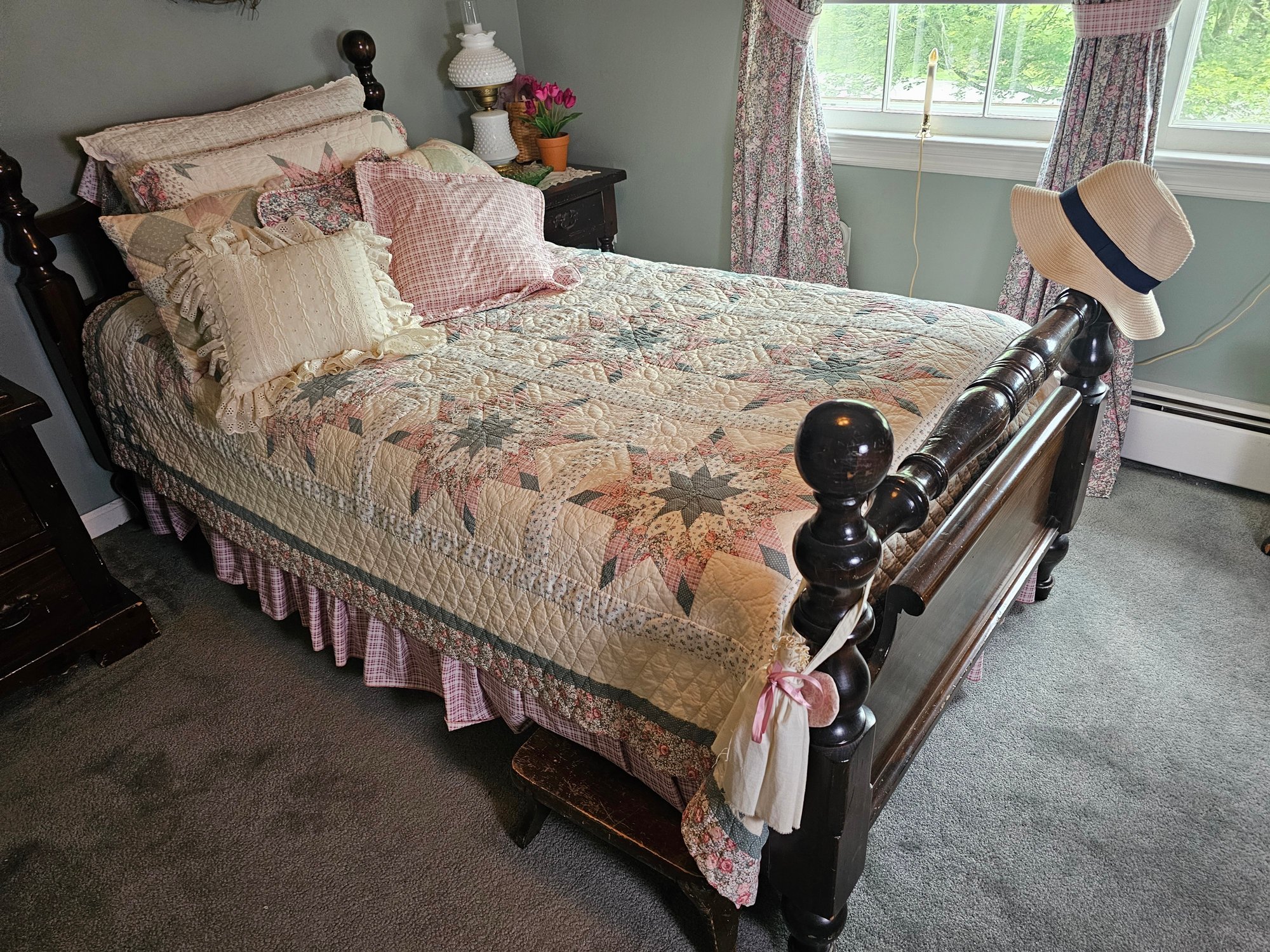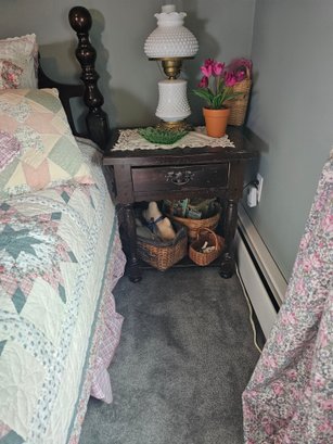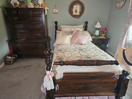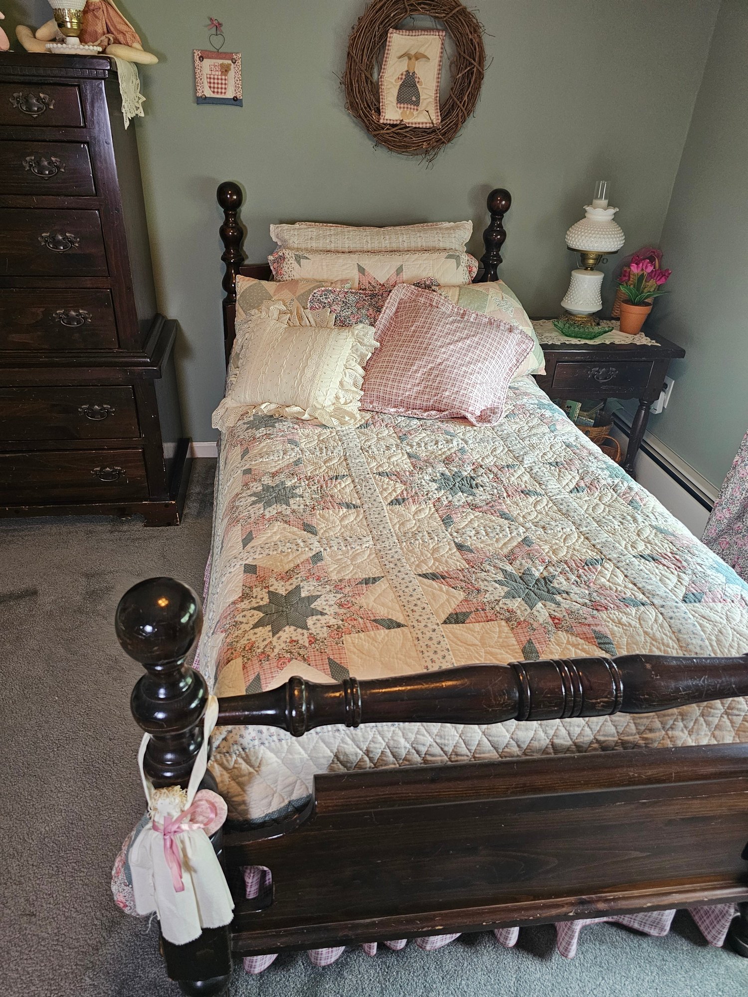 Three Piece Bedroom Set includes single bed, tall dresser and nightstand. Dresser is 39x21x56 nightstand is 22x17x25 and the bed is 42x82. Linens included. Mattresses included and not inspected