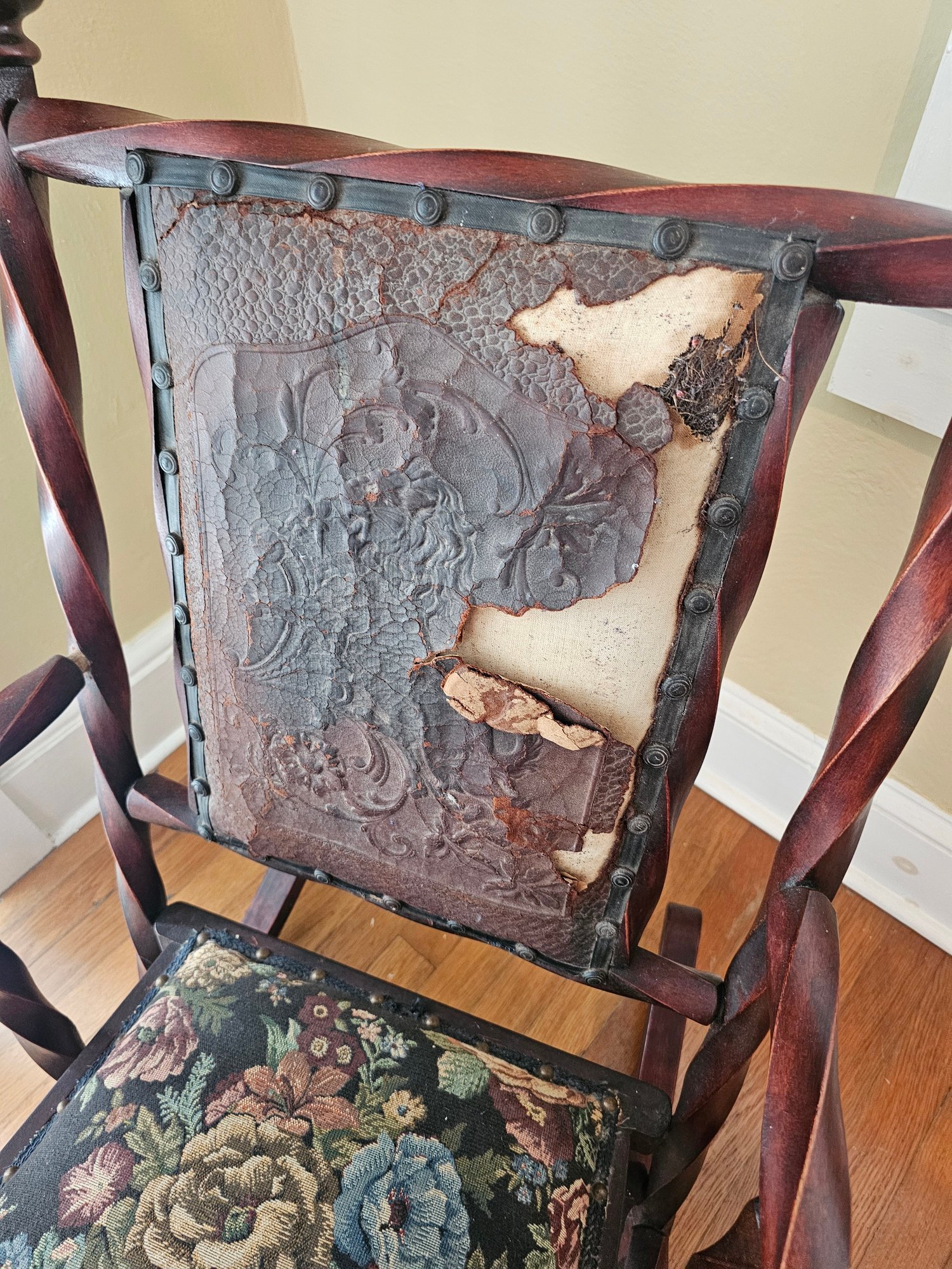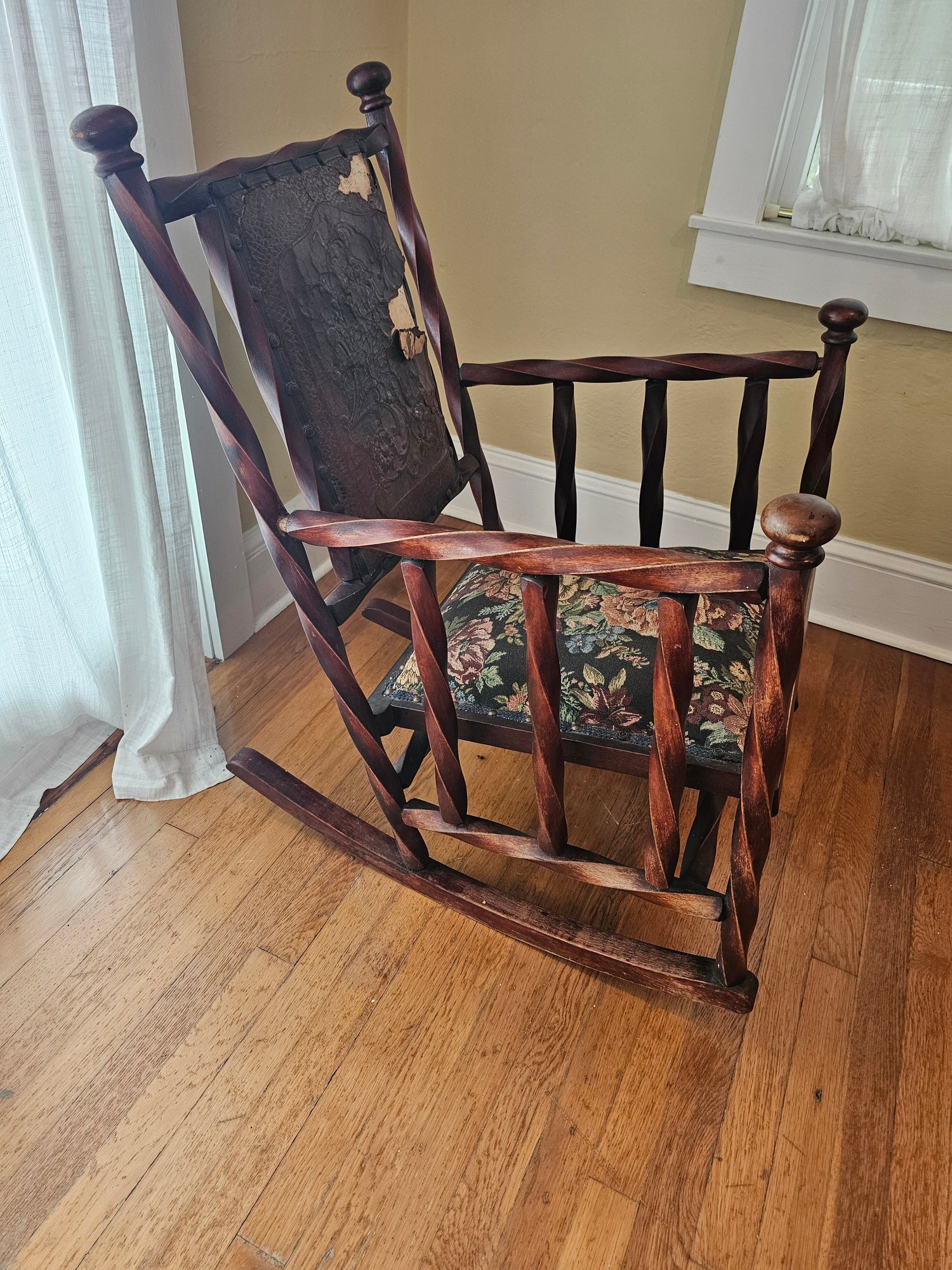 Twisted Wood Rocker in need of Restoration, leather backing missing