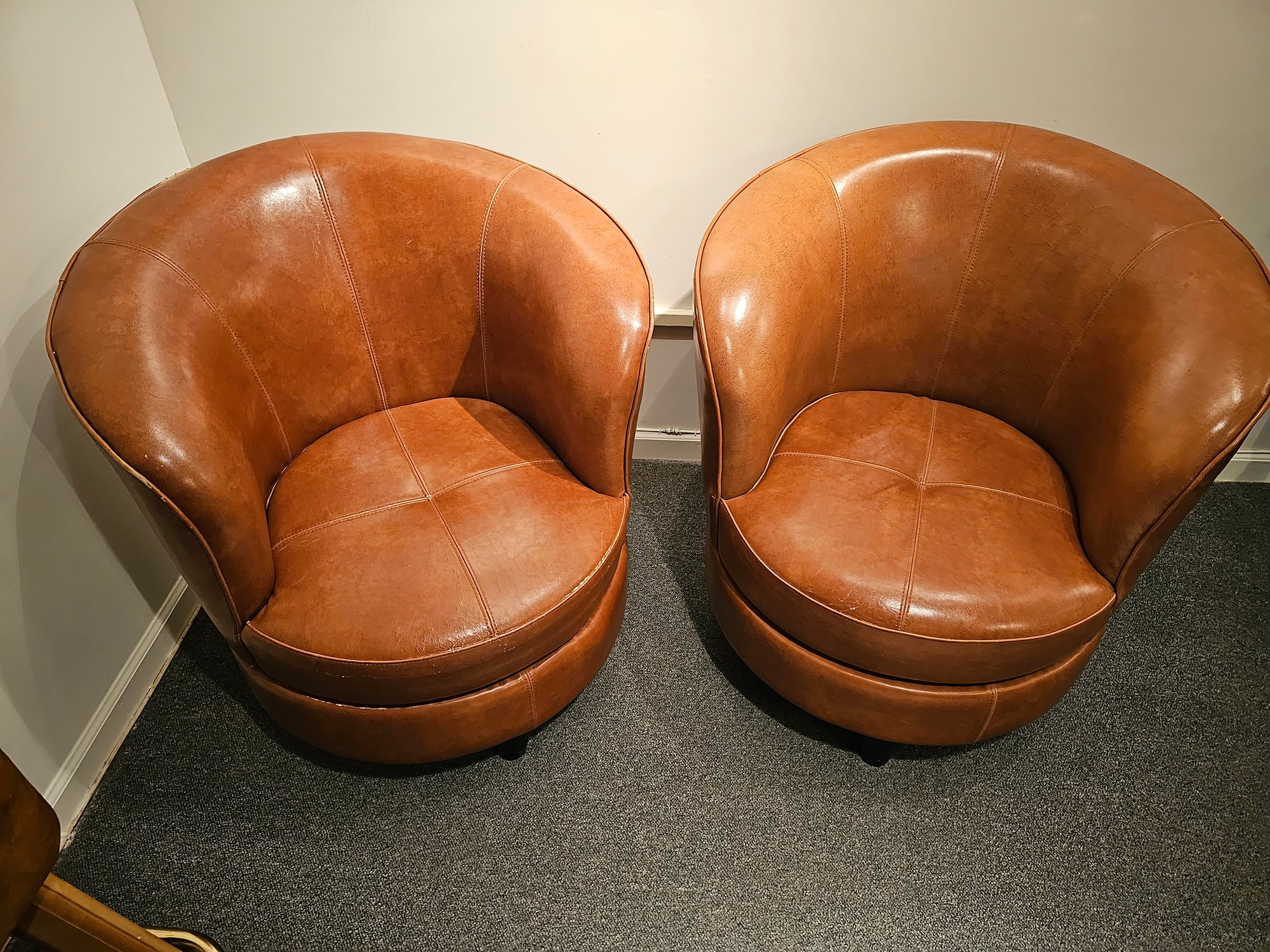 Two Gorgeous Leather Swivel Chairs, notice some rubbing to the back from being too close to a wall. Measures 31x32