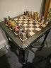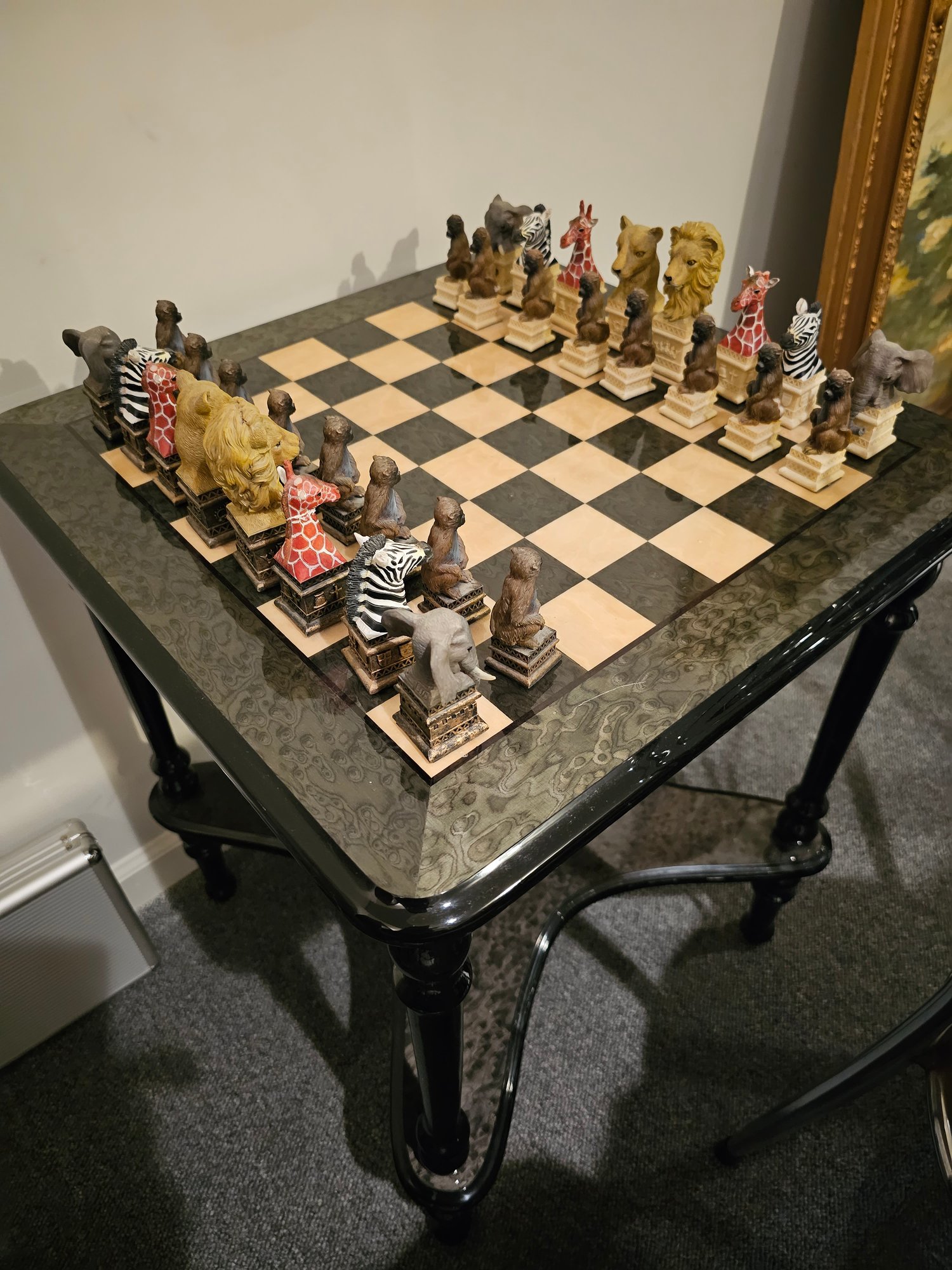Unusual Chess Set Featuring African Animals, likely made of a composite material. Very unique. Table included