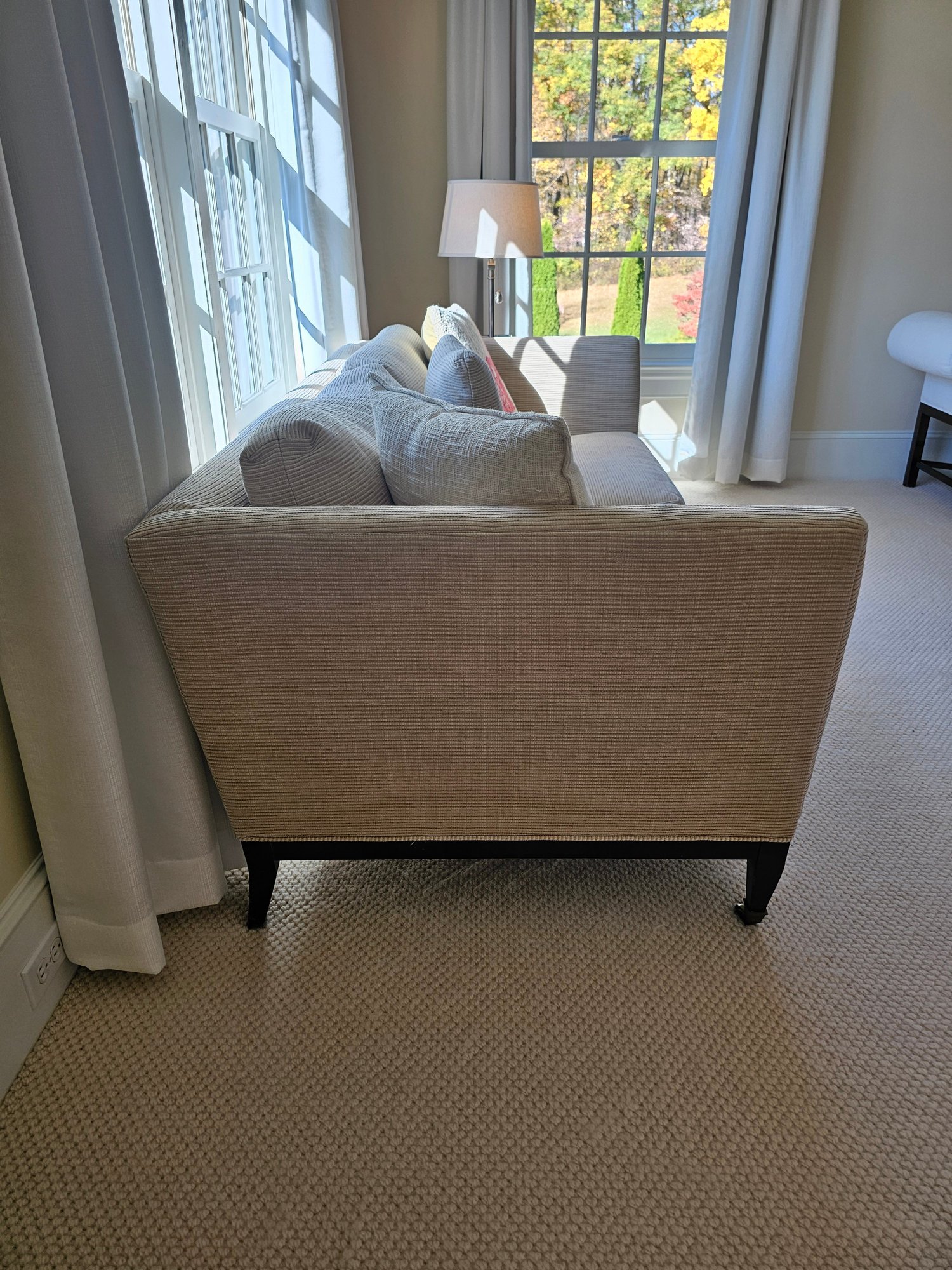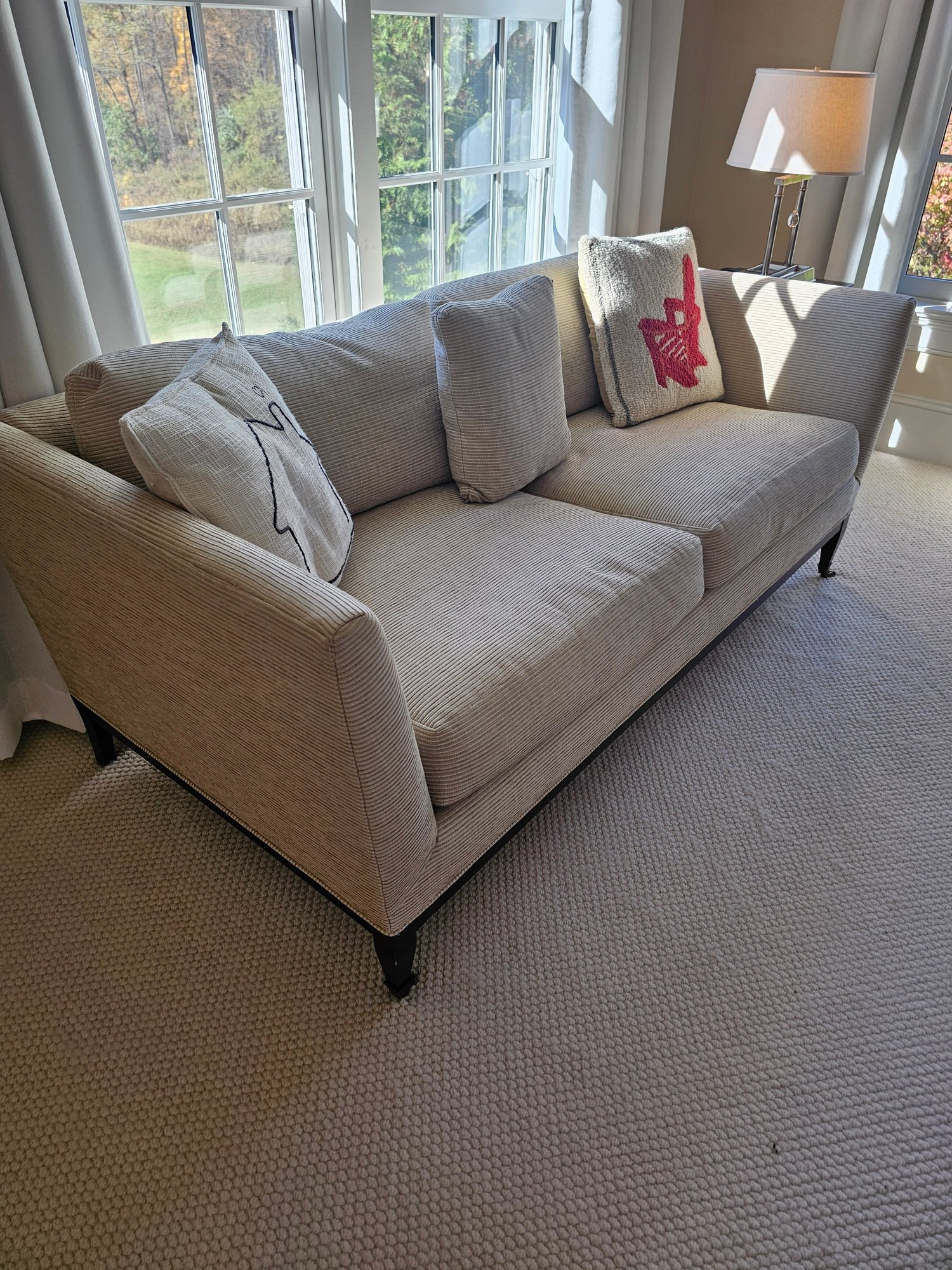 Very Pretty Sofa by Hamilton Furniture, tapered legs with brass casters. 36x72x21