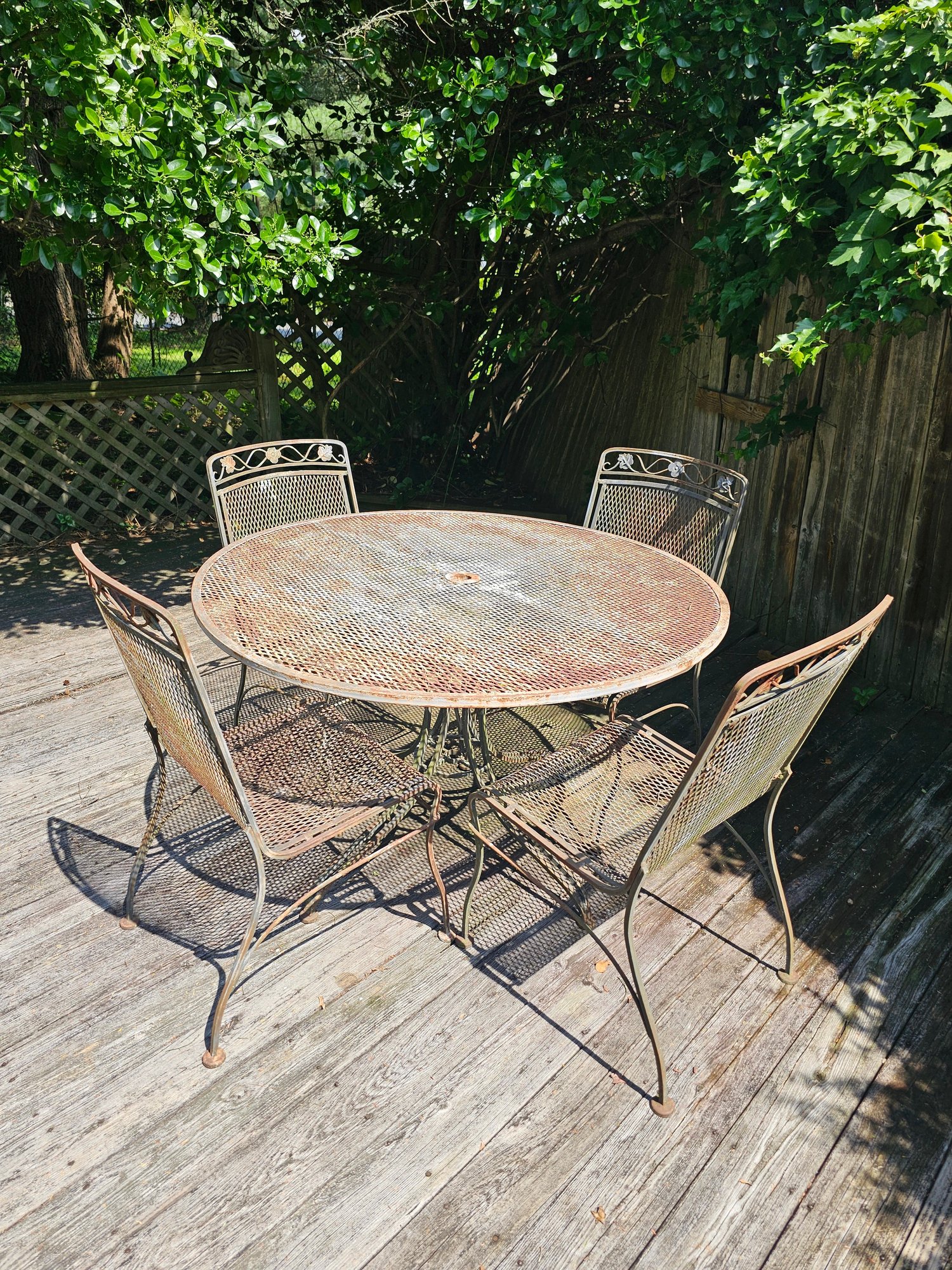 Vintage cast iron table and Chairs, table measures 48 in diameter, chairs are 19x22x36. Feels very solid. I did not observe any portions where mesh was coming away. Great candidate for a new coat of paint or add instant age and patina to your garden space as it is.