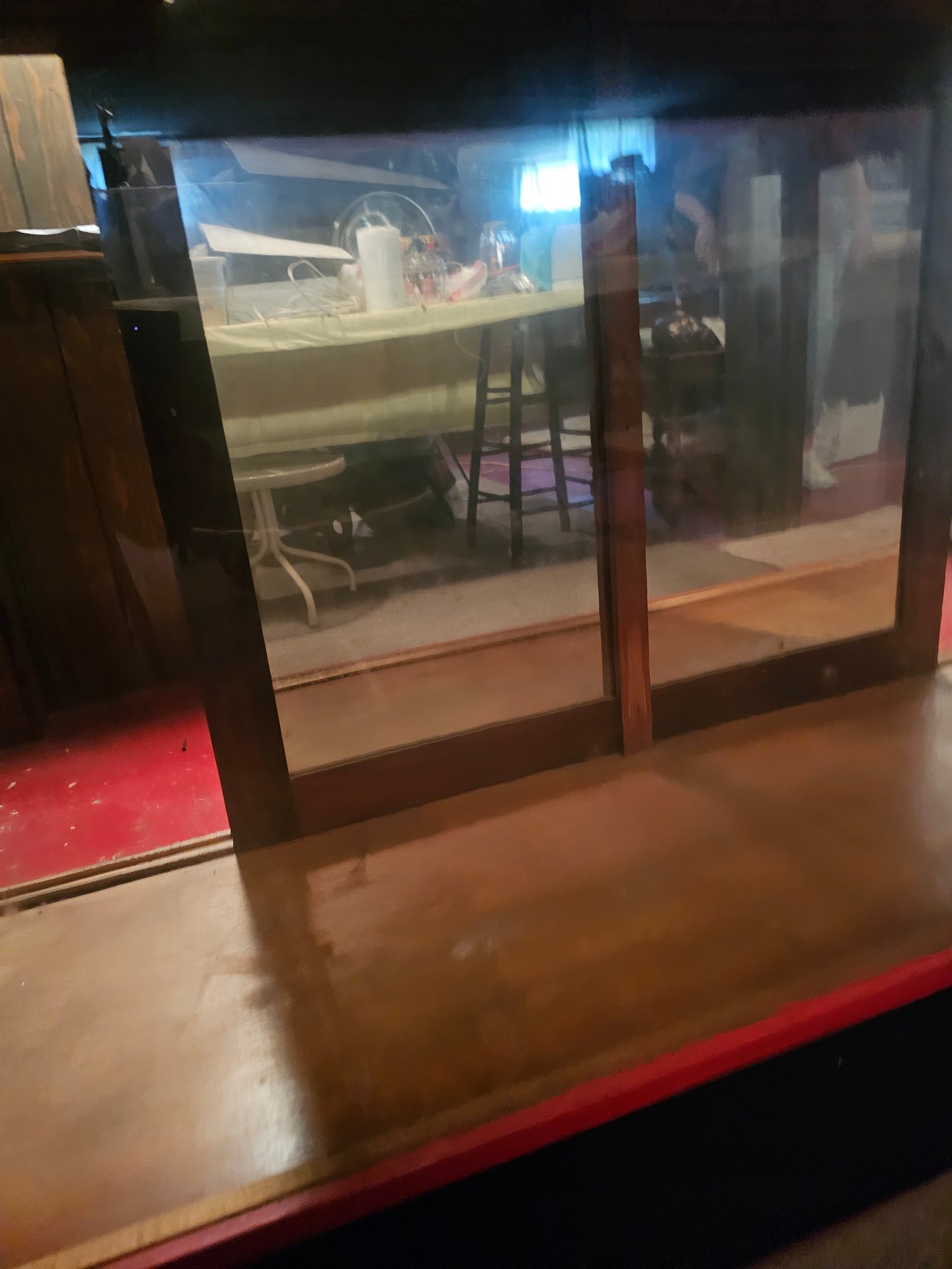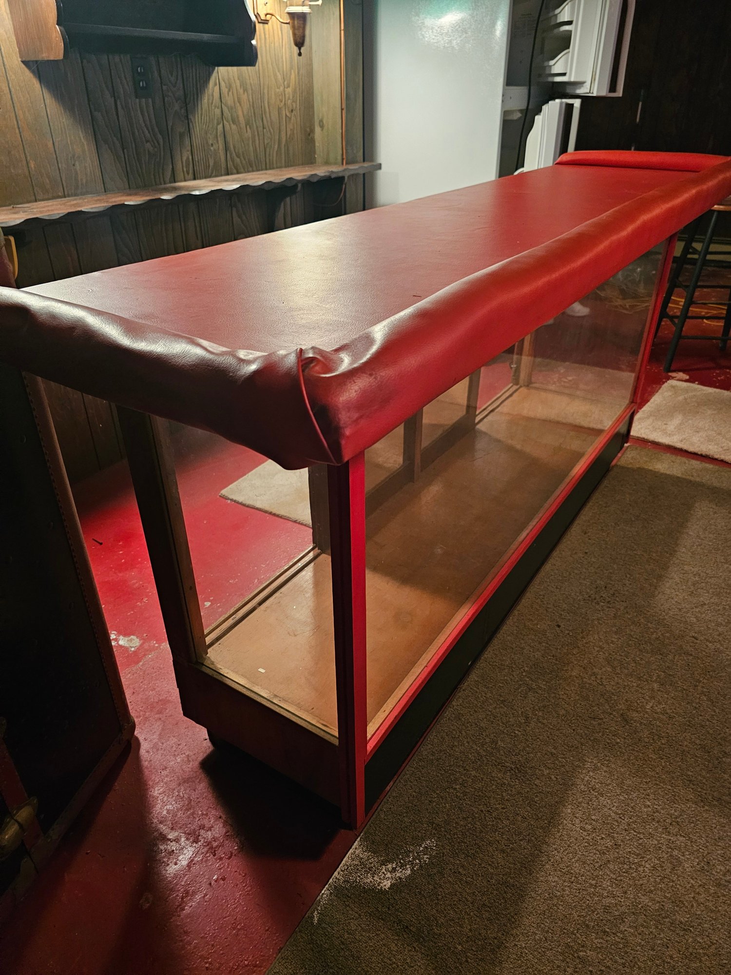 Vintage Display Case Turned Bar, 88x24x40. Mirrored back panel. Use as is or bring it back as a display case -