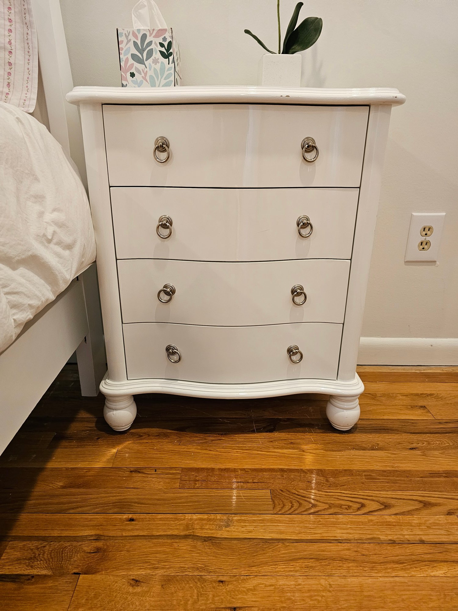 White Four Drawer Nightstand, minor scuffs on top and a scratch to right rear foot. I will try to get another picture before auction close (I noticed the scratch later and forgot to photograph it)