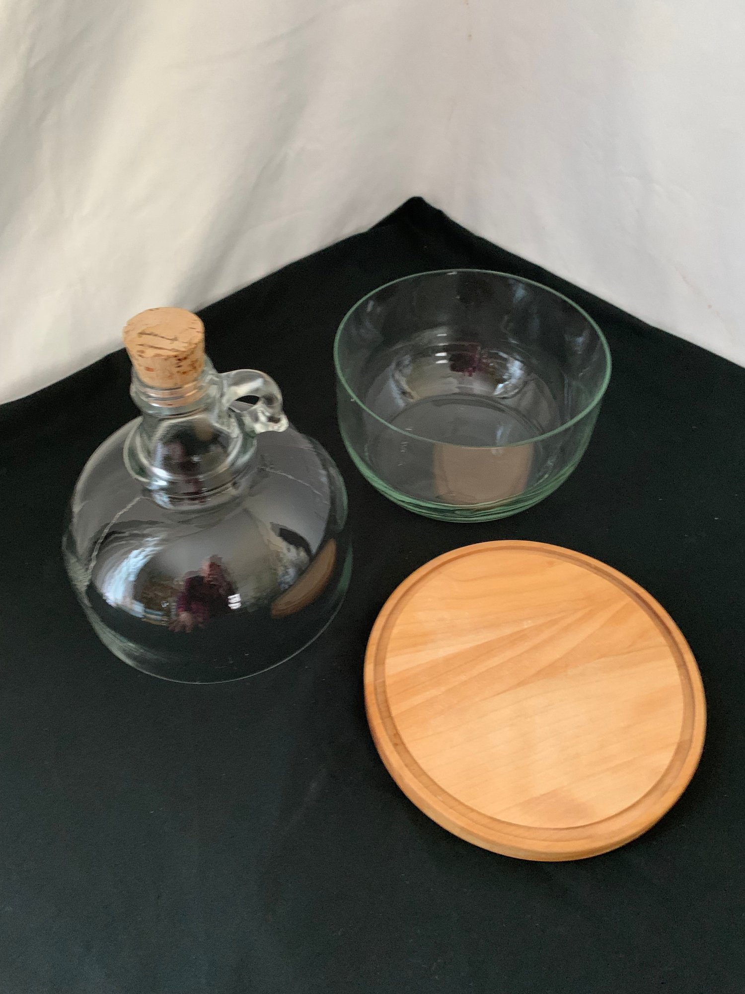 Notes: gallon jug with dome covered Wooden board & bowl is pre-owned showing light signs of wear commensurate with age & use. Please review picture