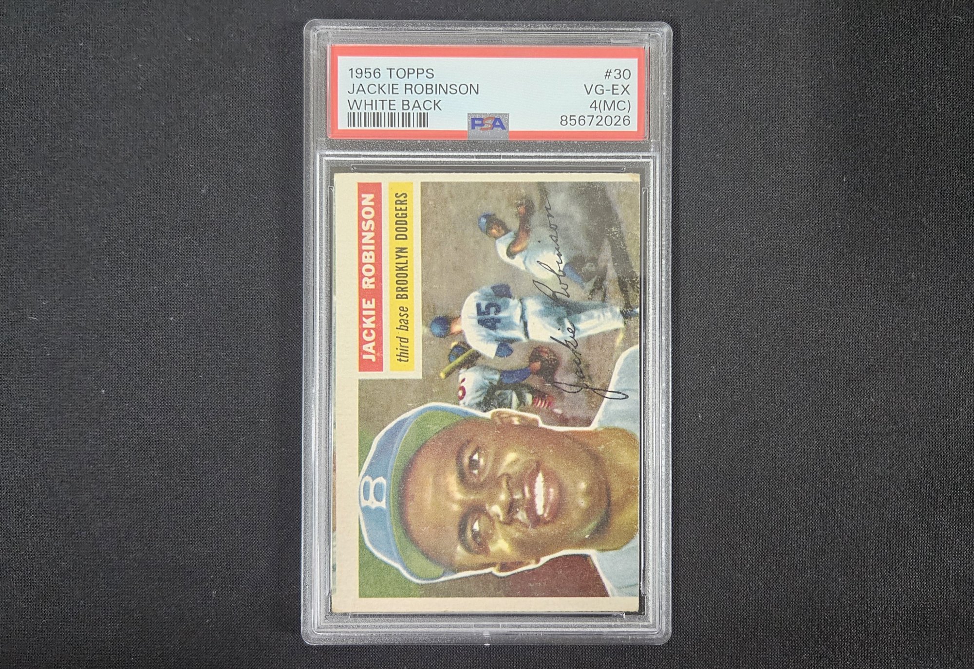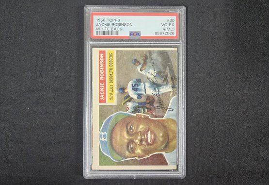 Notes: 1956 Topps #30 Jackie Robinson White Back Baseball Sports Card is graded VG-EX 4(MC: Mis-Cut) by PSA. Please review pictures.