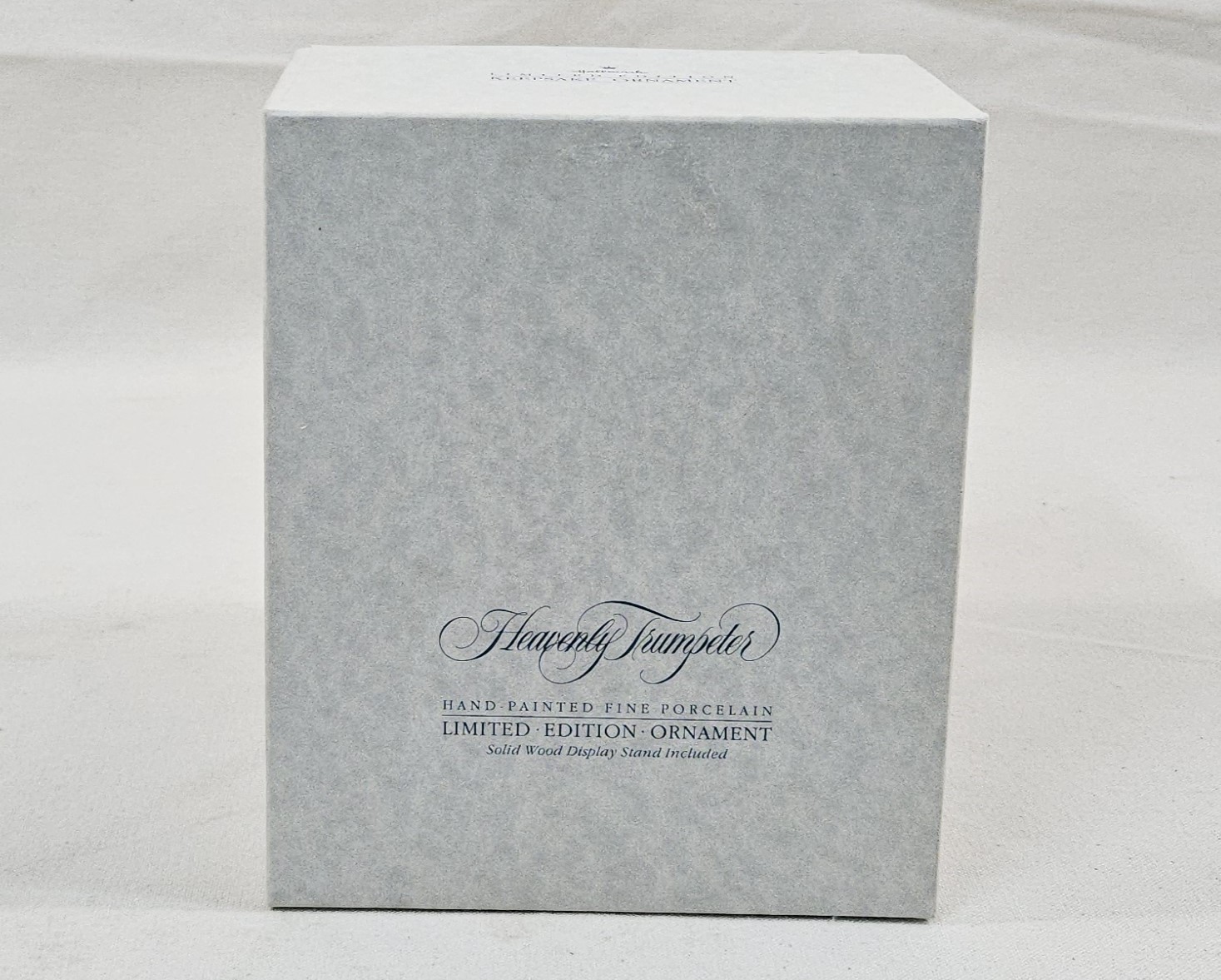 Boxed Hallmark Limited Edition Keepsake Ornament hand-painted fine porcelain Heavenly Trumpeter with solid wood display stand. Produced by Hallmark Cards, Inc.