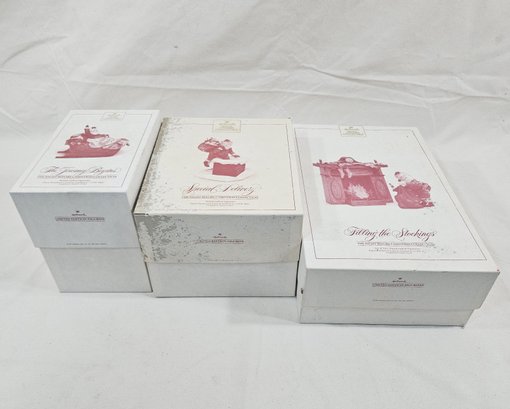 Group of ~3 limited edition Hallmark Gold Crown Collectible The Night Before Christmas handcrafted figurines including The Journey Begins, Special Delivery, and Filling the Stockings all numbered to 17,350. Sculpted by Duane Unrub.