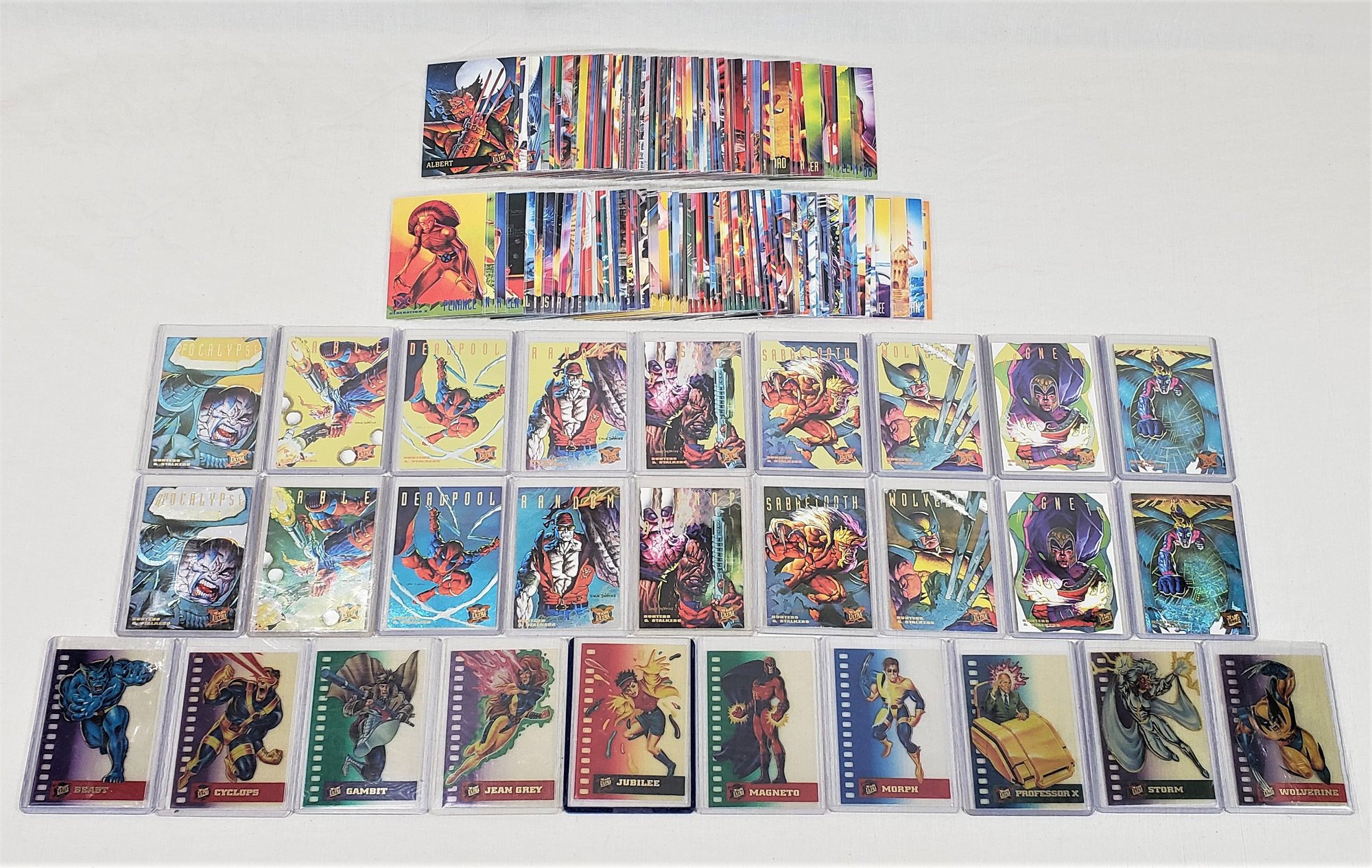 Complete Fleer Ultra X-Men non-sport trading card base set 1-150 with limited edition inserts subsets Hunters & Stalkers rainbow & gold 1-9, & Suspended Animation 1-10. Produced by Fleer.