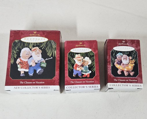 Group of ~3 boxed Keepsake Collector's Series The Clauses on Vacation Ornaments including 1-3. Produced by Hallmark Cards, Inc.