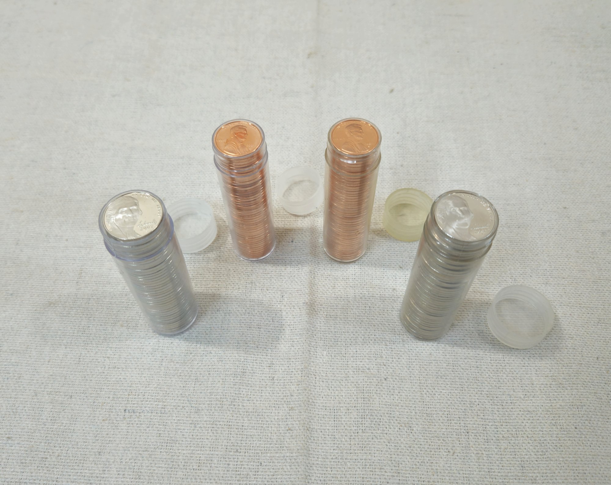 1999-2010 proof U.S. Penny & Nickel Rolls with 2 rolls containing 100 one cent pennies and 2 rolls containing 80 five cent nickels.