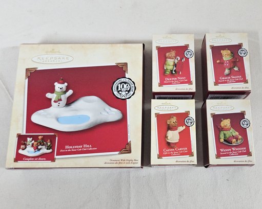 Group set of ~5 boxed Keepsake Snow Cub Club Collection Ornaments including Hollyday Hill, Wendy Whoosh, Dexter Next, Grace Skates, & Calvin Carver. Produced by Hallmark Cards, Inc.