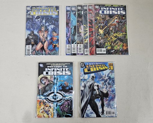 Group of Infinite Crisis comic books including issues 1-7 with key issues #3 & #5, Prelude to Infinite Crisis, and Countdown to Infinite Crisis: One Shot. Published by DC Comics.