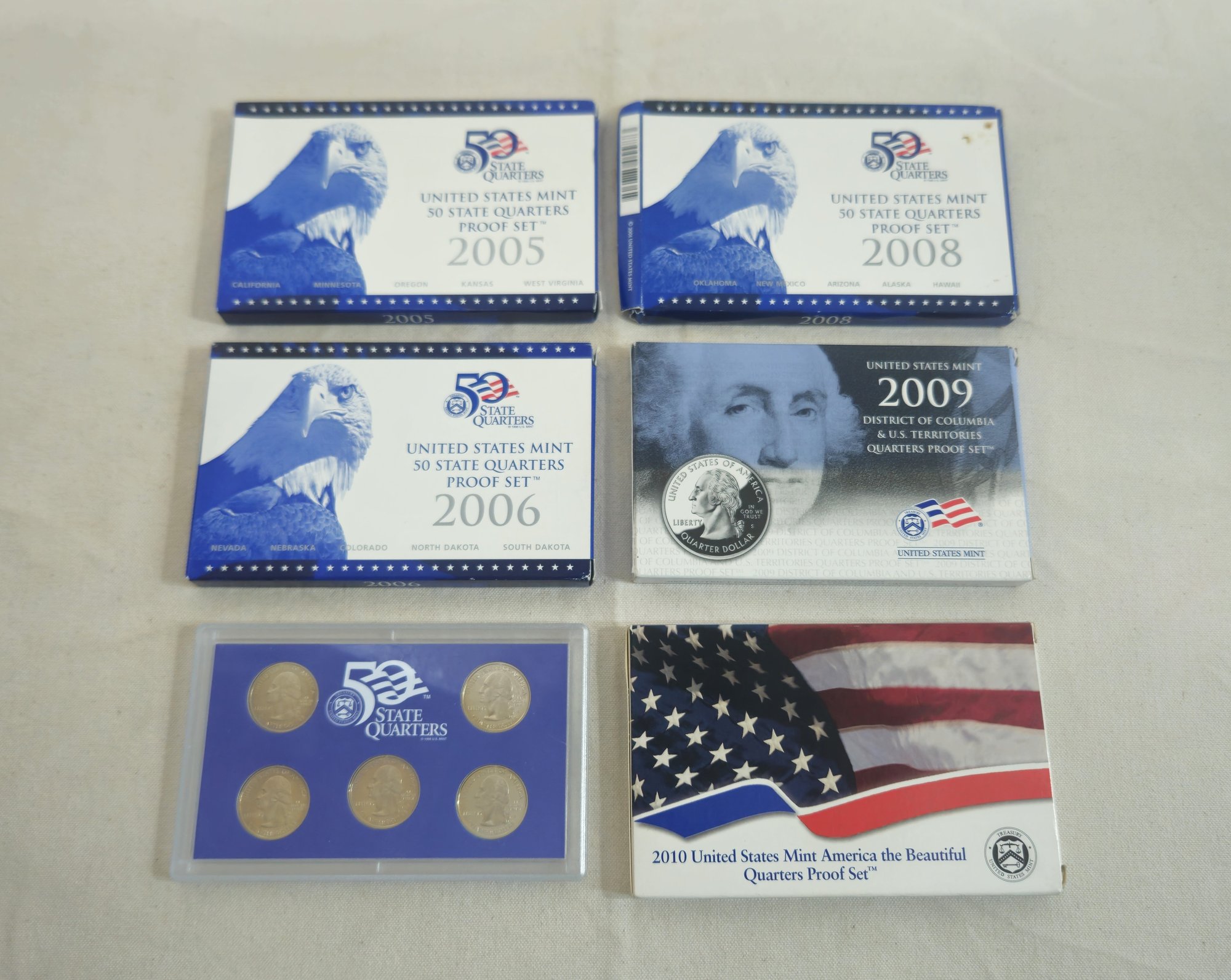 Group of ~6 U.S. Mint Quarters Poof Sets including 2005-2008 50 State Quarters, 2009 DC & US Territories, & 2010 America the Beautiful.
