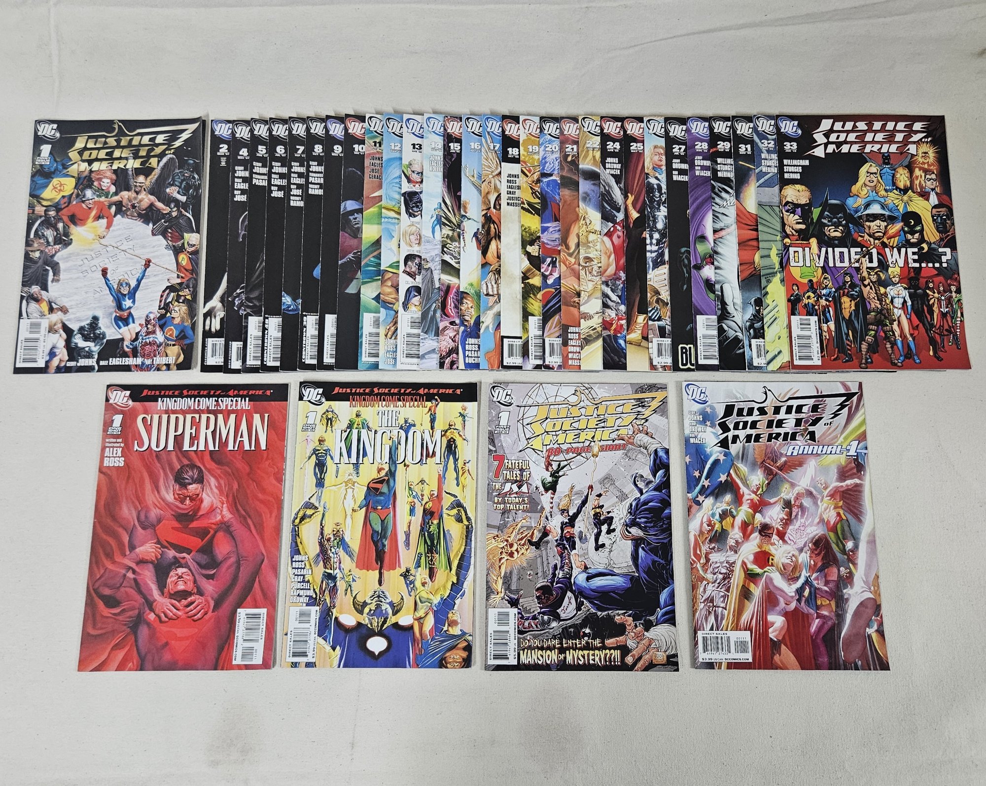 Group of Justice Society of America comic books including Vol. 3 issues 1, 2, 4-22, 24-29, & 31-33, Kingdom Come Special: The Kingdom & Superman, 80-Page Giant, and Annual #1. Published by DC Comics.