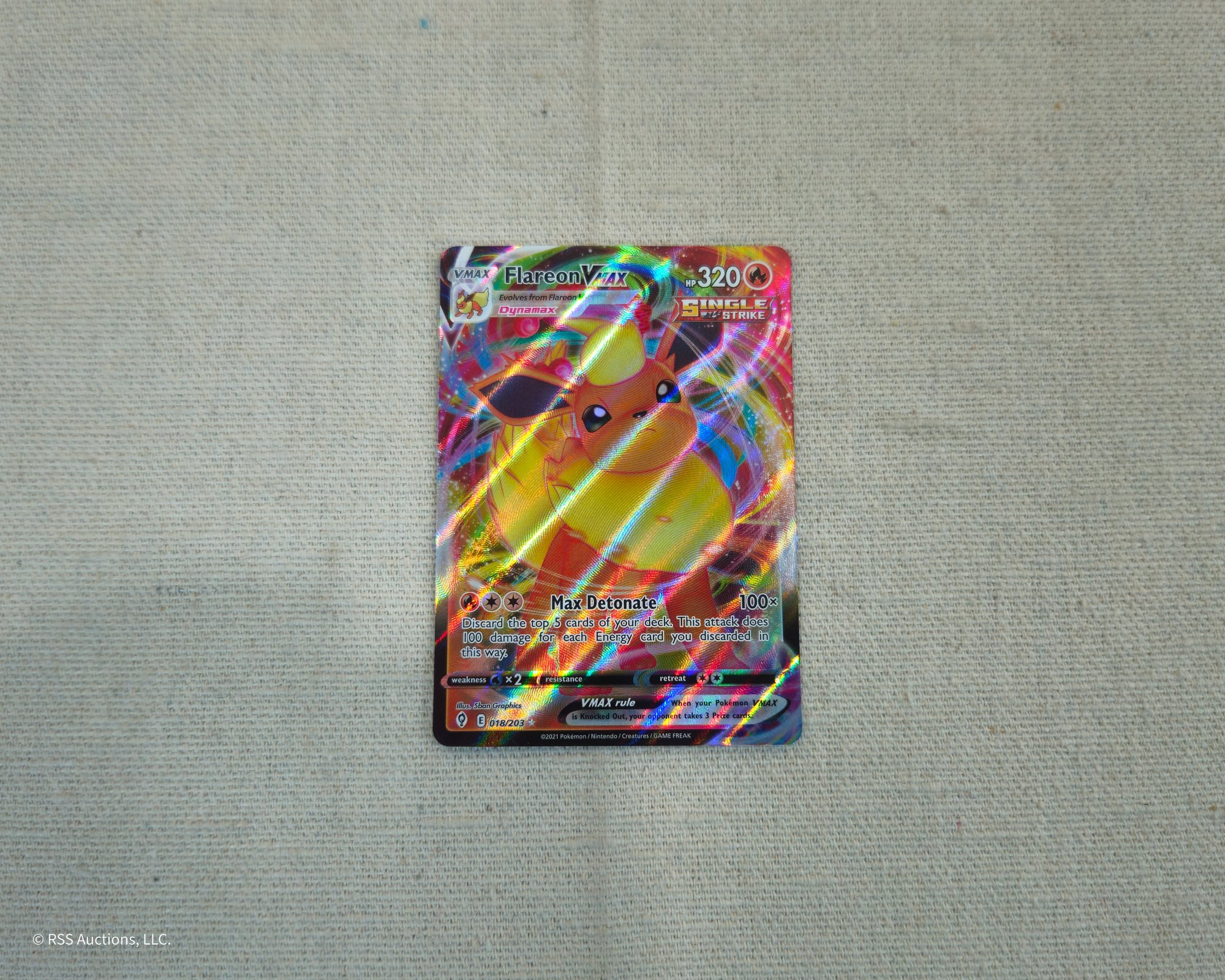 Pokemon Sword & Shield: Evolving Skies Flareon Vmax #018/203 ultra rare holofoil trading card.