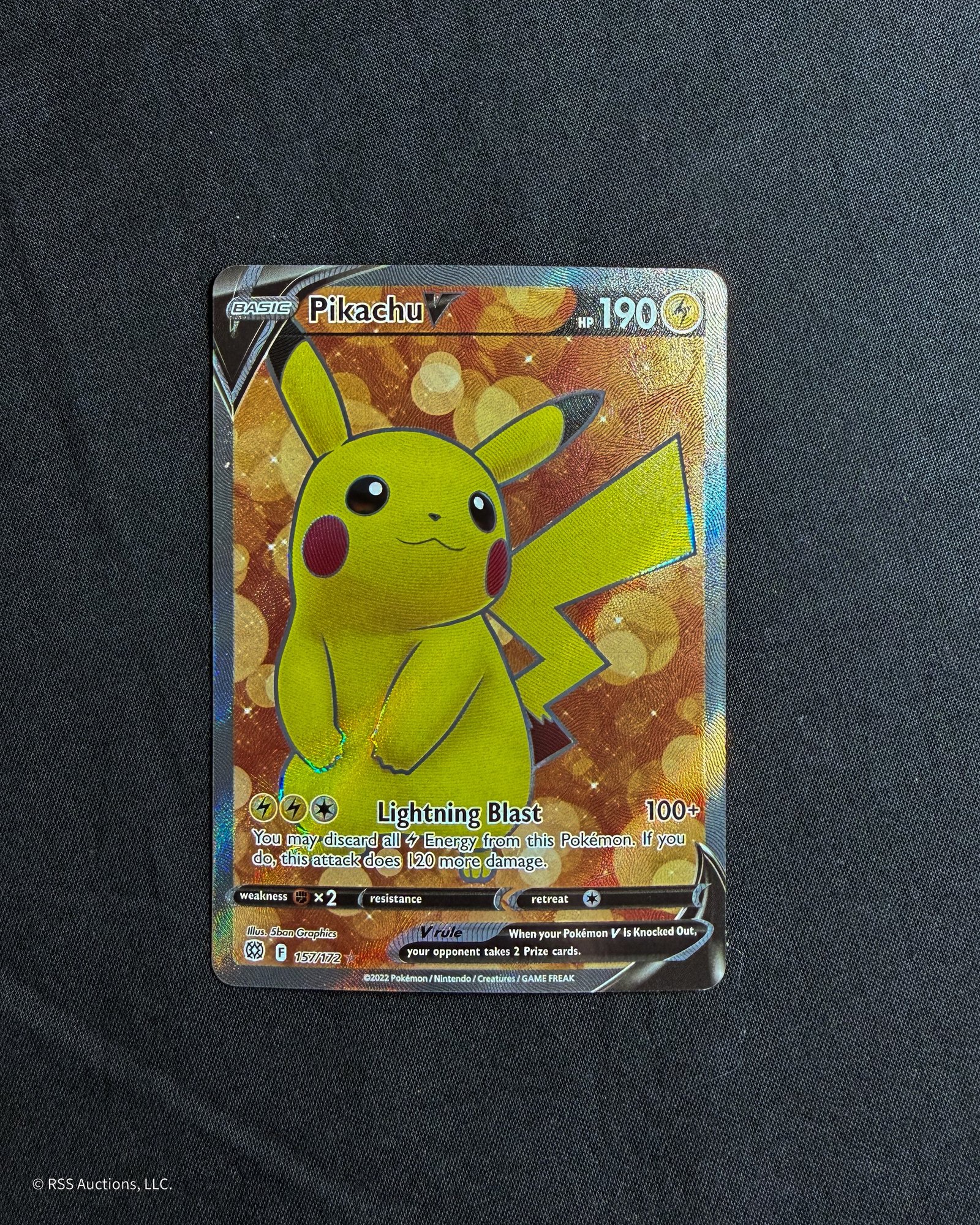 Pokemon Sword & Shield: Brilliant Stars Pikachu V #157/172 full art ultra rare trading card.