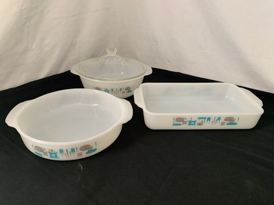 Cake pan, ~8", round, Utility dish, ~6 1/2" x ~10 1/2" and Casserole w/crystal knob cover