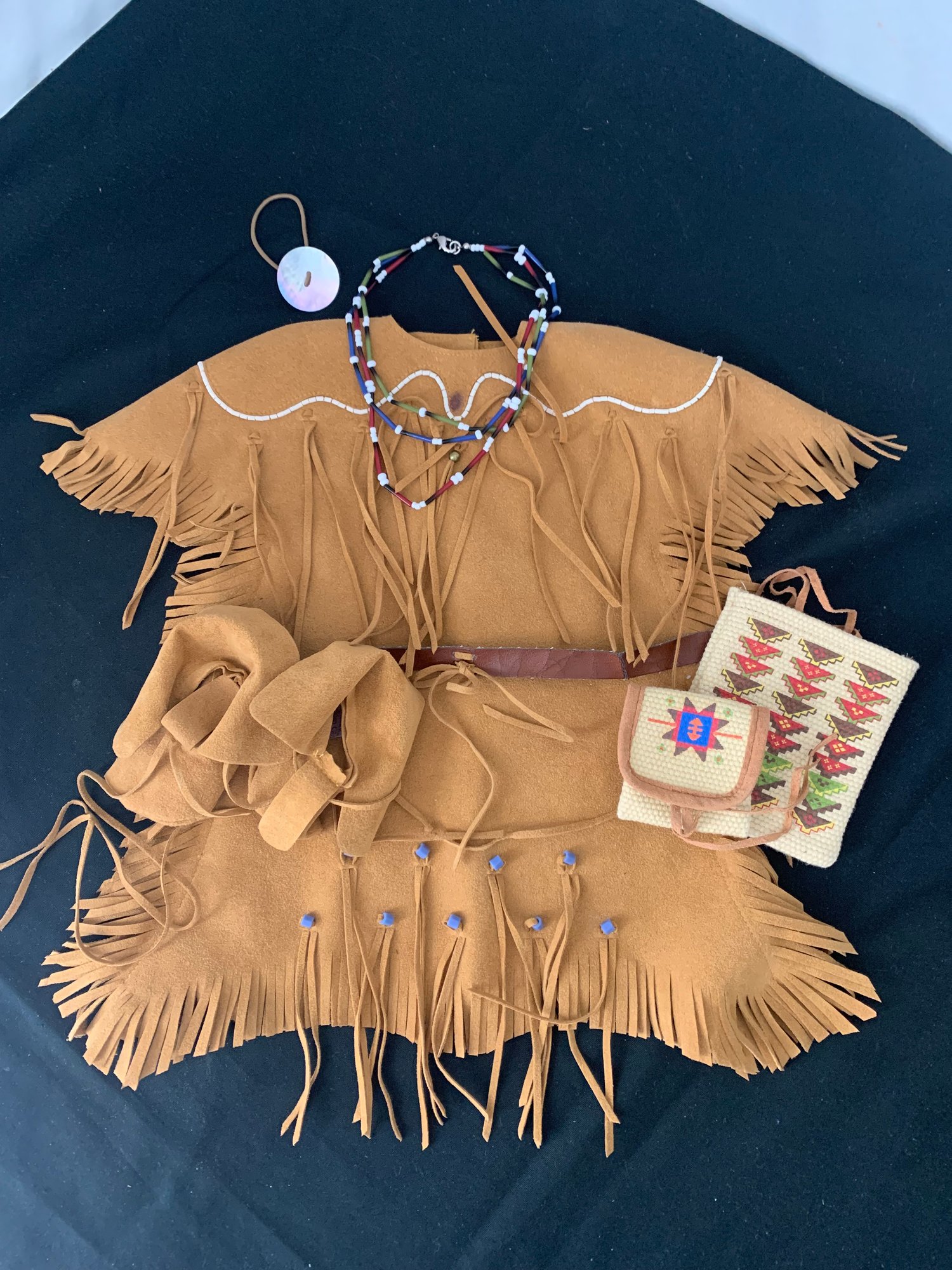 American Girl Kaya's meet outfit - faux leather deerskin dress, faux leather belt (well worn), moccasins & shell hair ties (only one) Accessories - woven pouch, matching bag & necklace (looks like dyed porcupine quills)