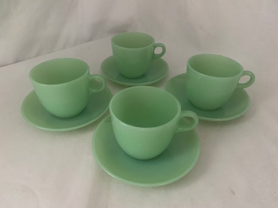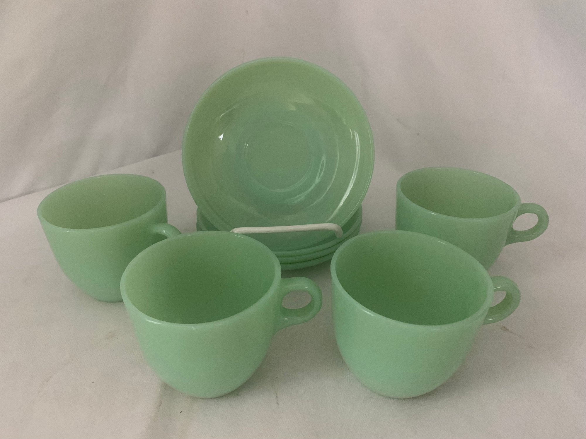 Notes: Anchor Hocking Fire King Jadeite 1700 Line St. Denis Cups & Saucers Set is pre-owned showing light signs of wear commensurate with age & use and have no major apparent identifiable blemishes or flaws. Please review pictures.
