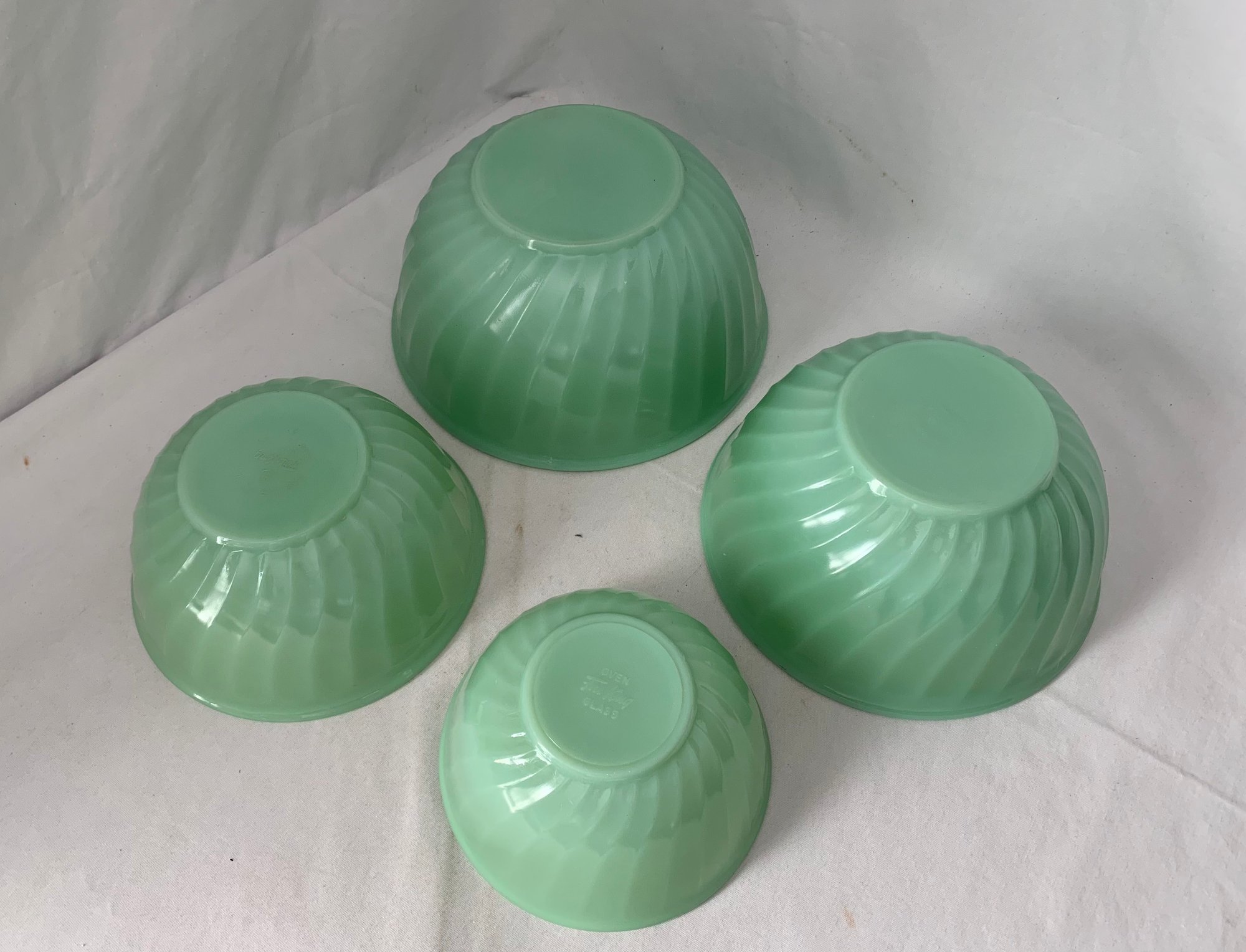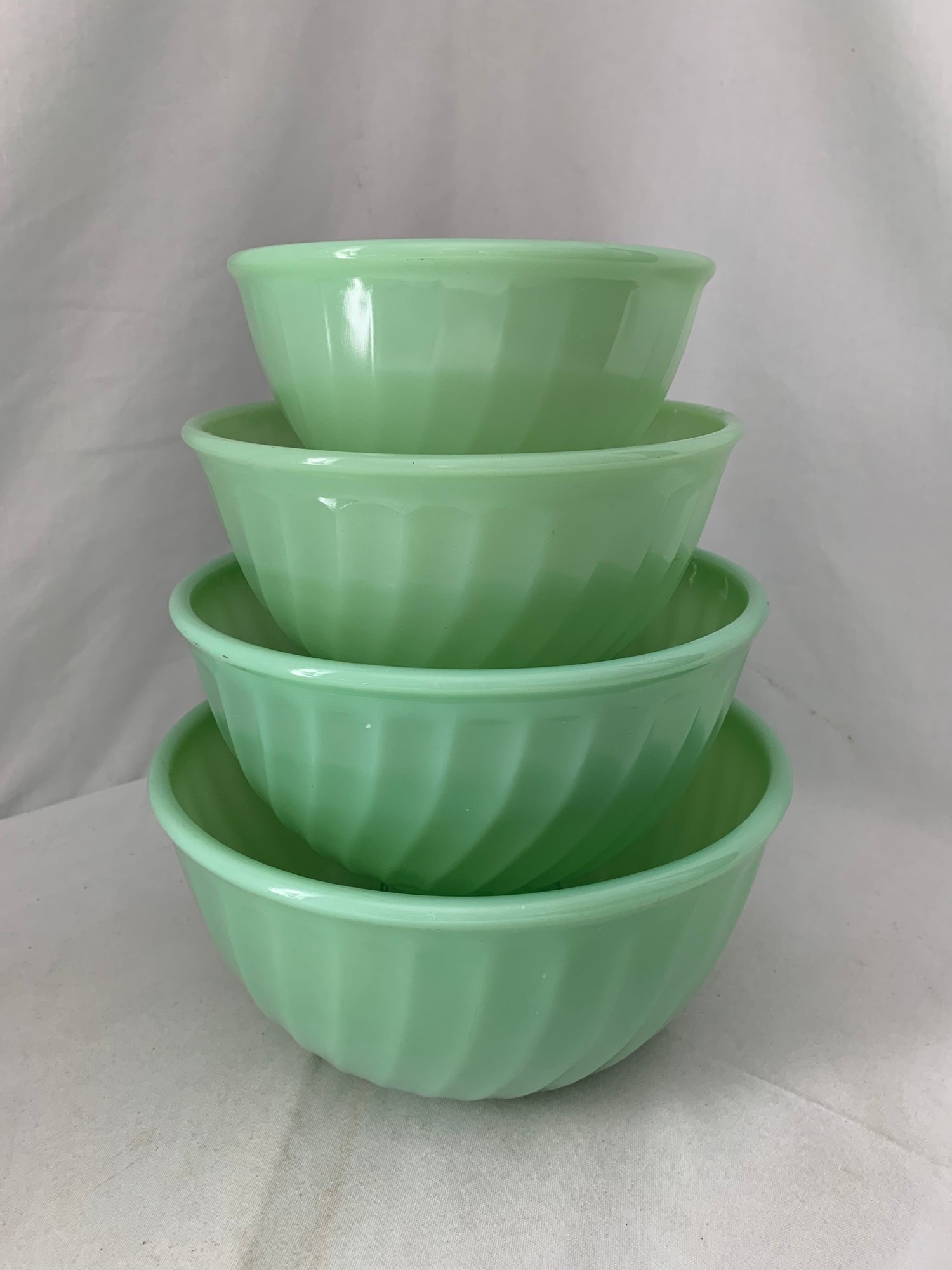 Notes: Anchor Hocking Fire King Jadeite Swirl Mixing Bowl Set is pre-owned showing light wear commensurate with age & use and has no major apparent identifiable blemishes or flaws. Please review pictures.