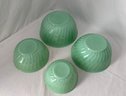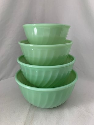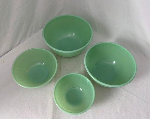 Set of ~4 nesting Fire King Jadeite mixing bowls including 6", 7", 8", & 9". Produced by Anchor Hocking Glass Works.