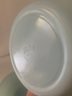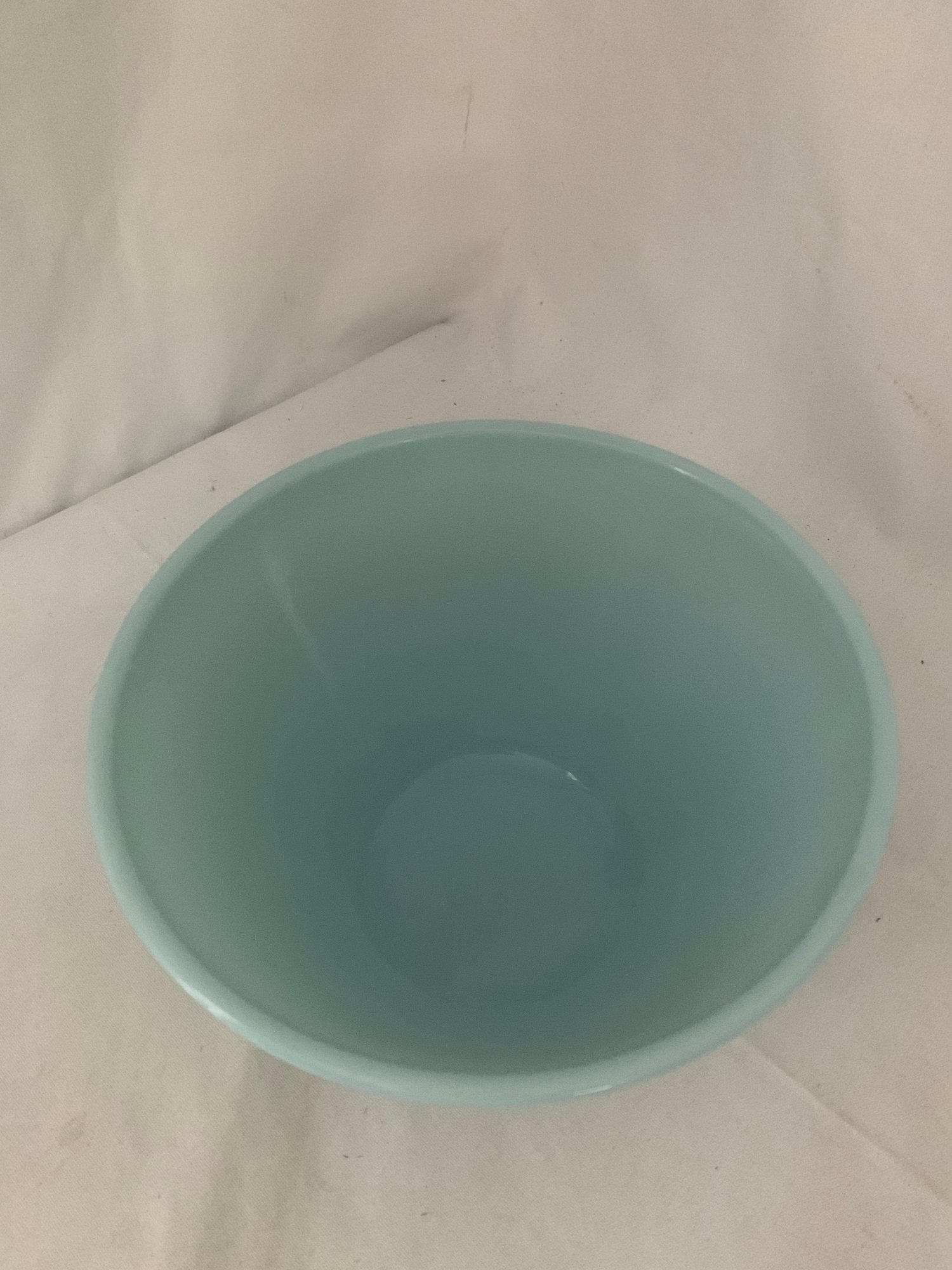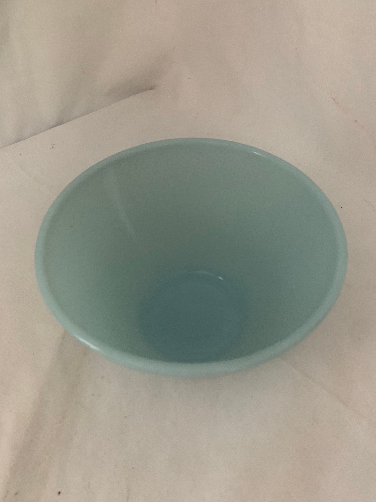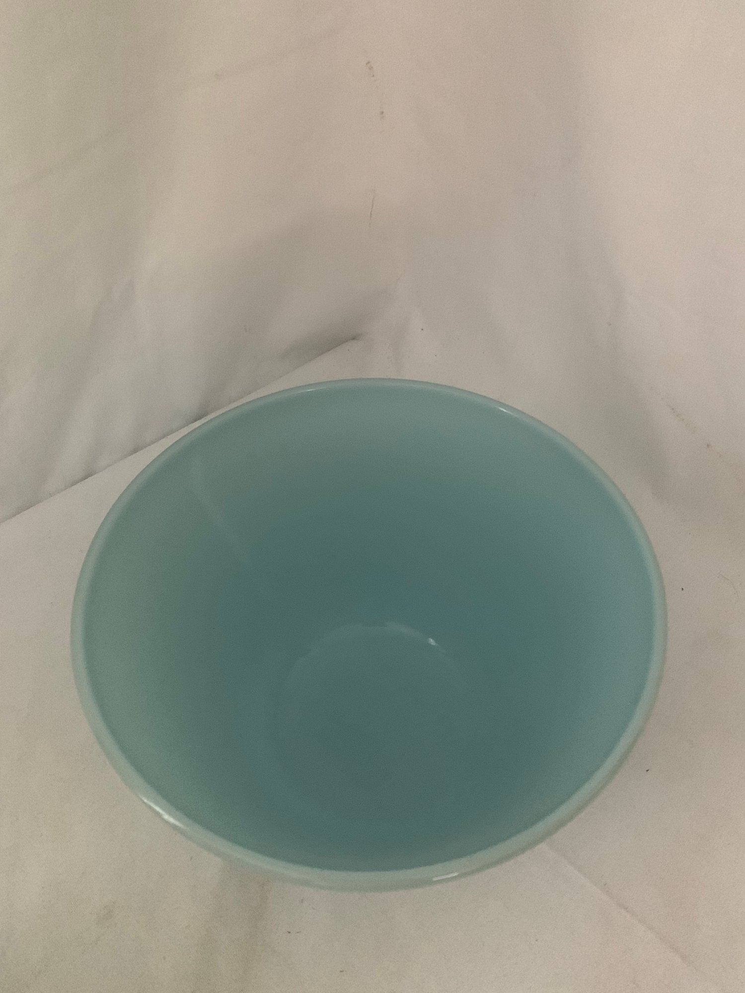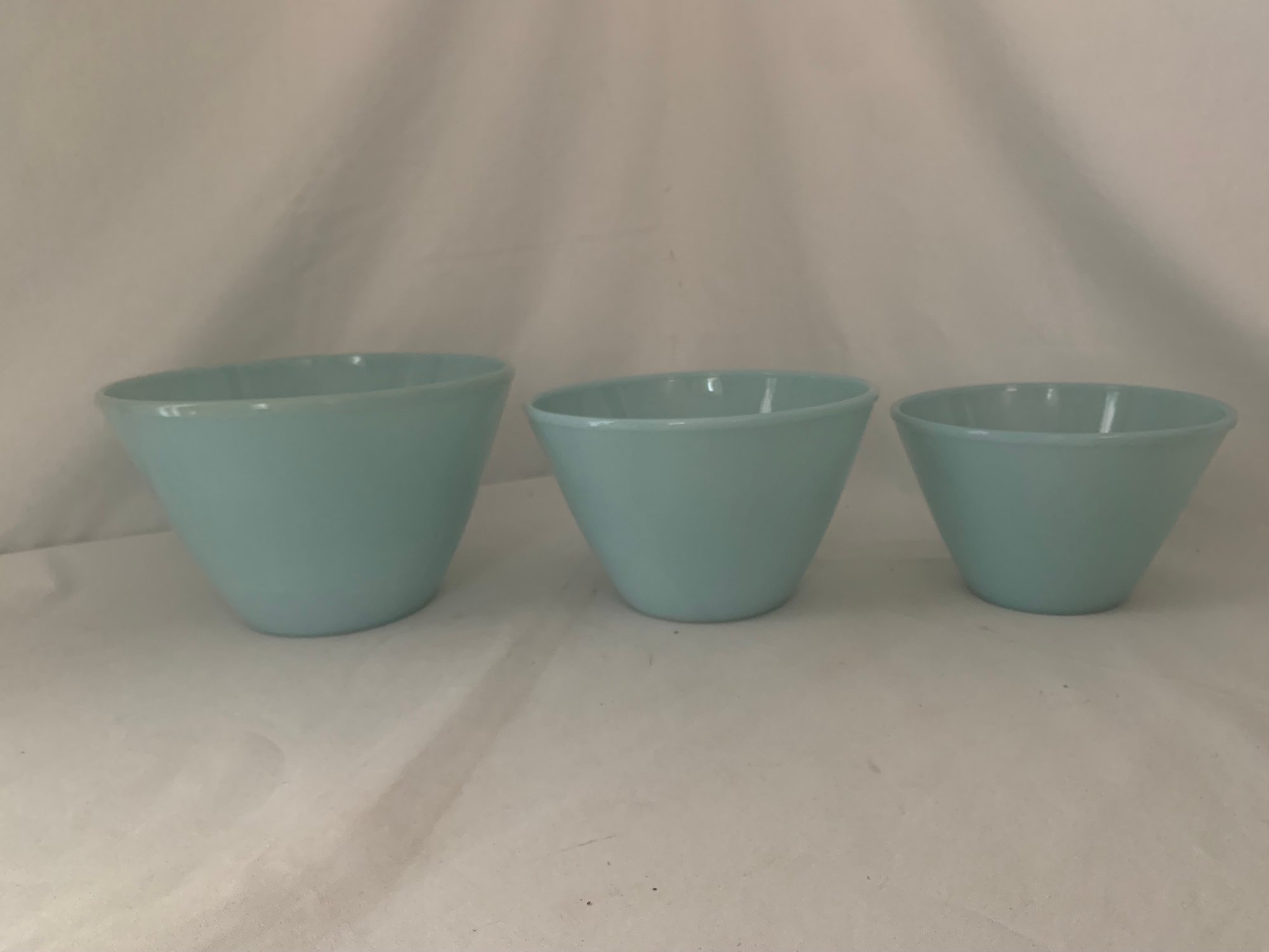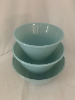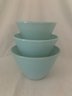 Set of ~3 Fire King turquoise blue splash proof nesting mixing bowls including a 1qt. bowl, a 2qt. bowl, and a 3qt. bowl. Produced by Anchor Hocking Glass Co.